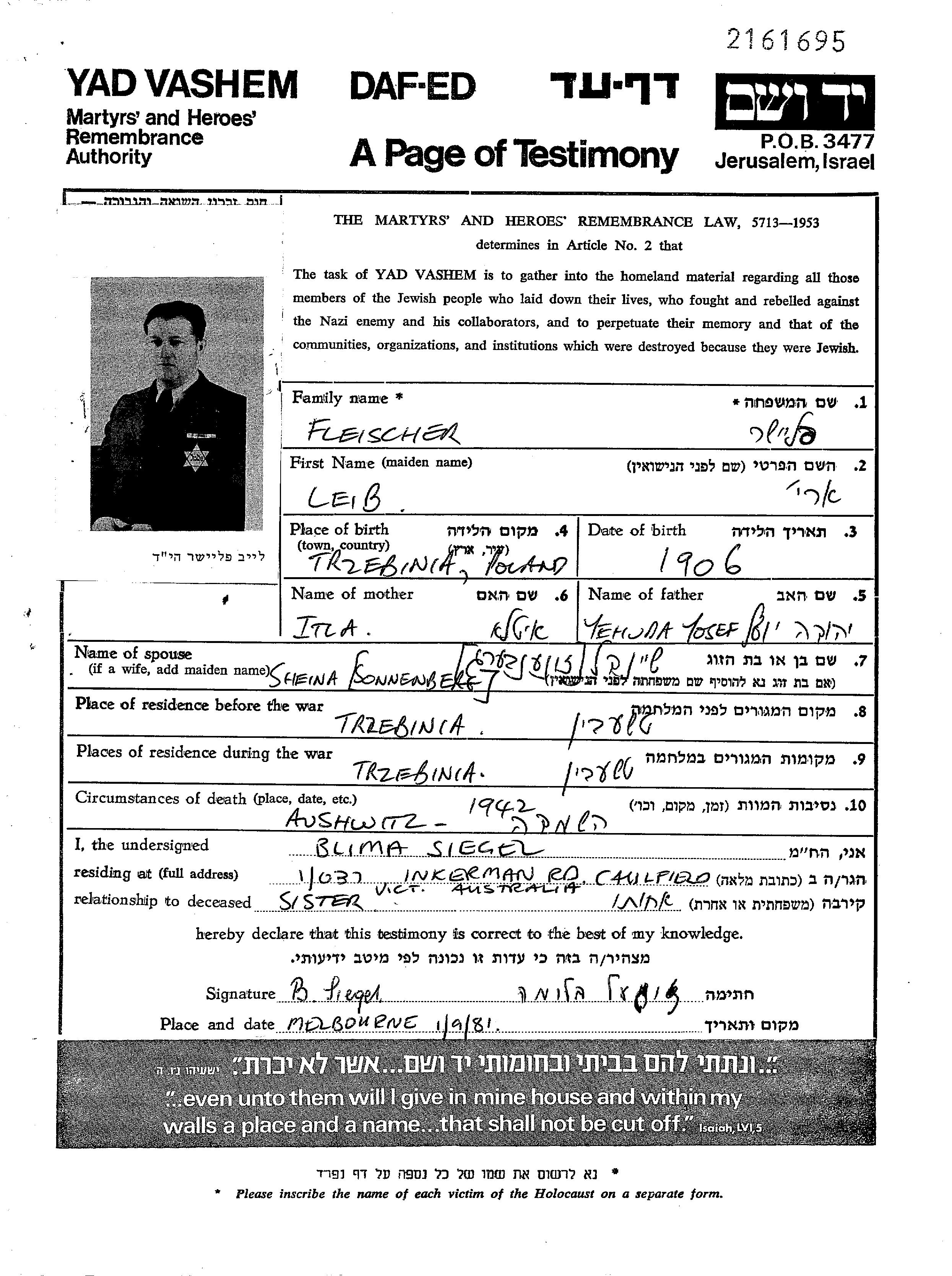 Fleischer Arie Leib 1906 Trzebinia, Polen Gedenkblatt
