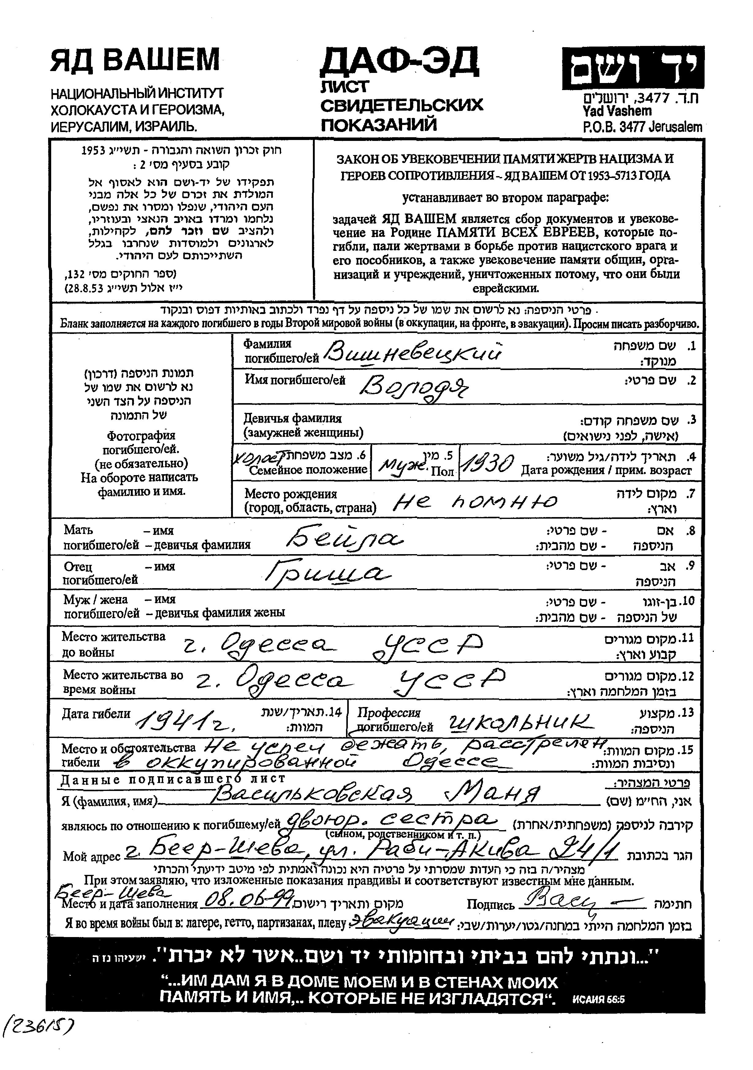Volodia Velvl Vishnevetzki wurde im Jahr 1930 in Odessa, Ukraine (UdSSR) geboren. Er war Schüler/-in. Vor dem Zweiten Weltkrieg lebte er in Odessa, Ukraine (UdSSR).