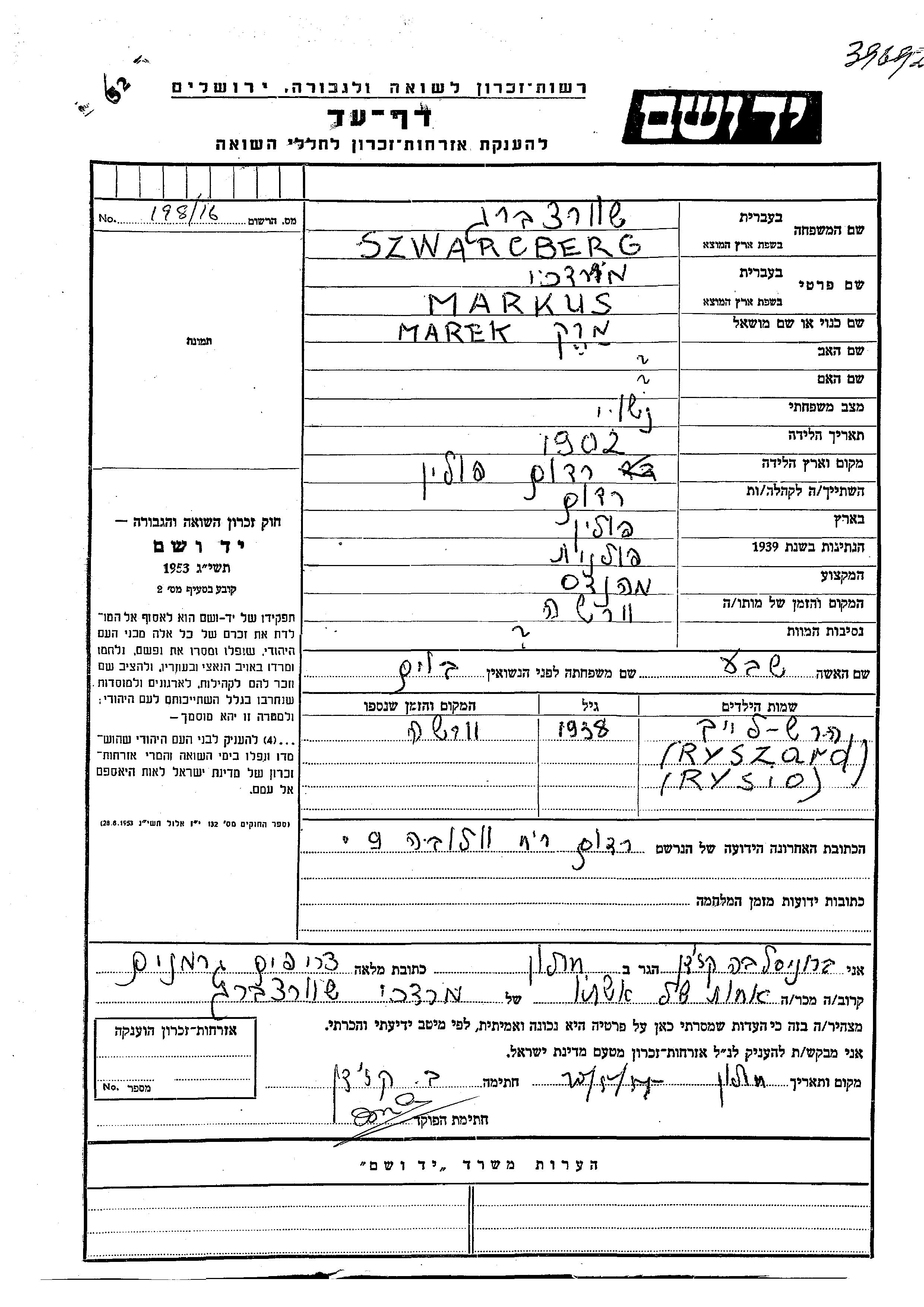Szwarcberg Rysio Hersh Leib 1938 Radom, Polen Gedenkblatt