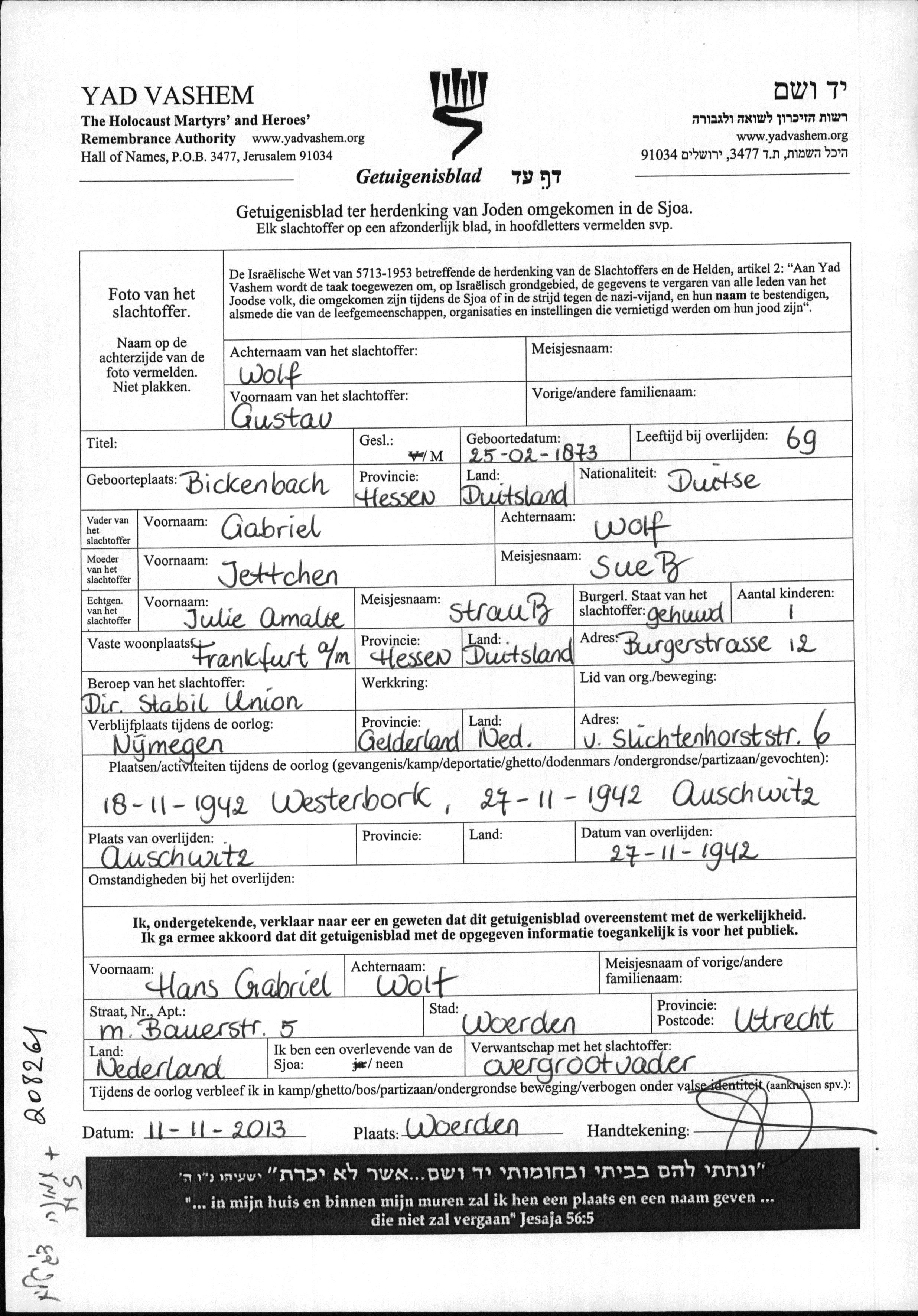 Wolf Gustav 1873 Frankfurt am Main, Deutsches Reich Liste von ermordeten Juden aus Deutschland
