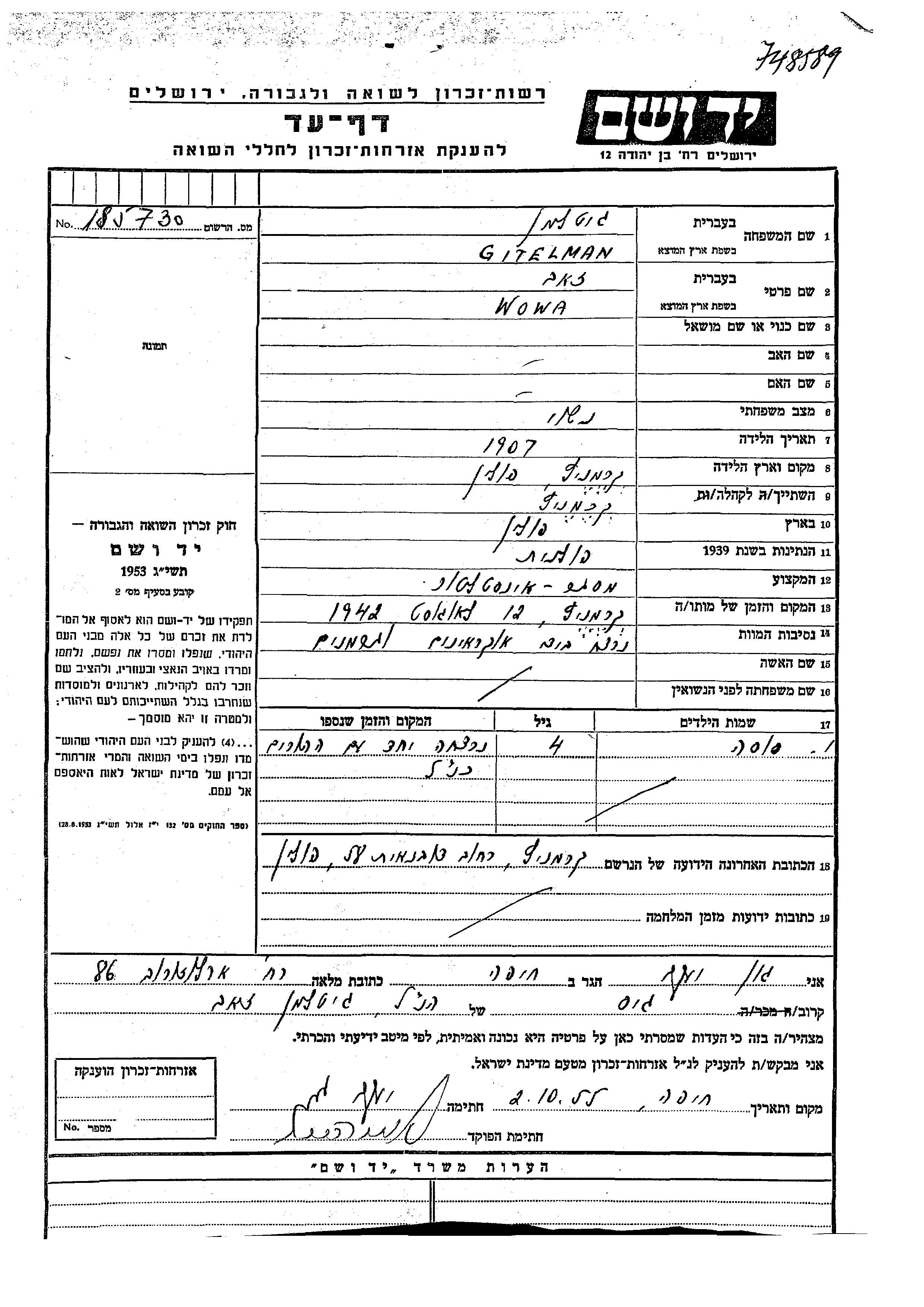 Wowa Zeev Gitelman wurde im Jahr 1907 in Kremenits, Polen geboren. Er war Schlosser und Verheiratet. Vor dem Zweiten Weltkrieg lebte er in Kremenits, Polen.
