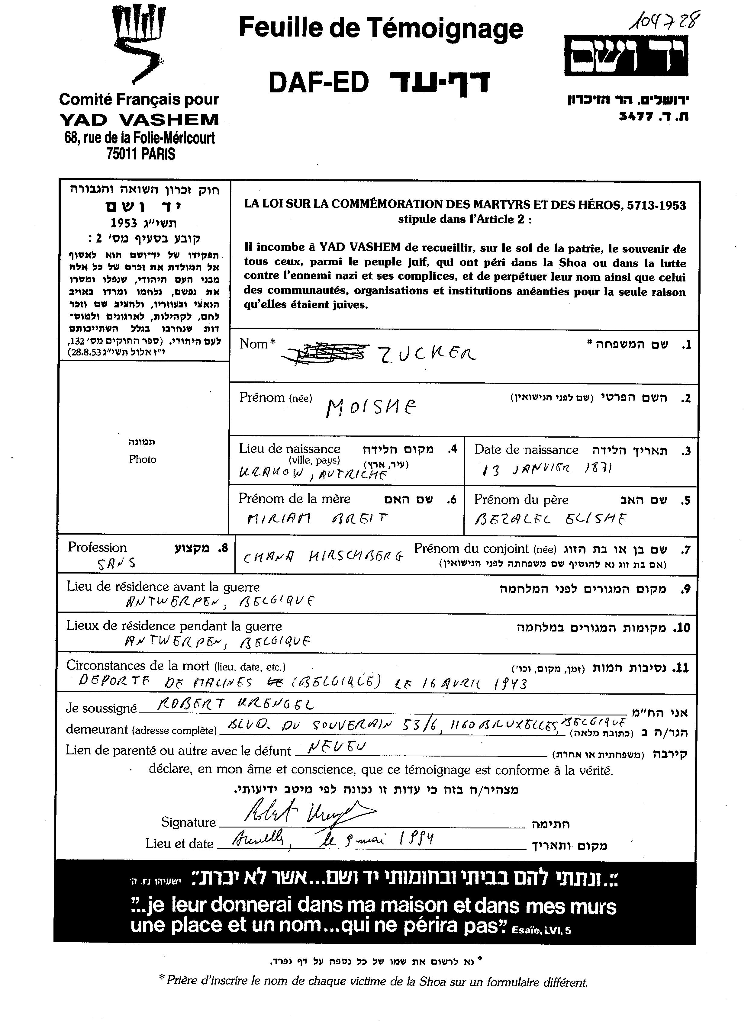 Zucker | Moishe | 1871 | Antwerpen, Belgien | Gedenkblatt |