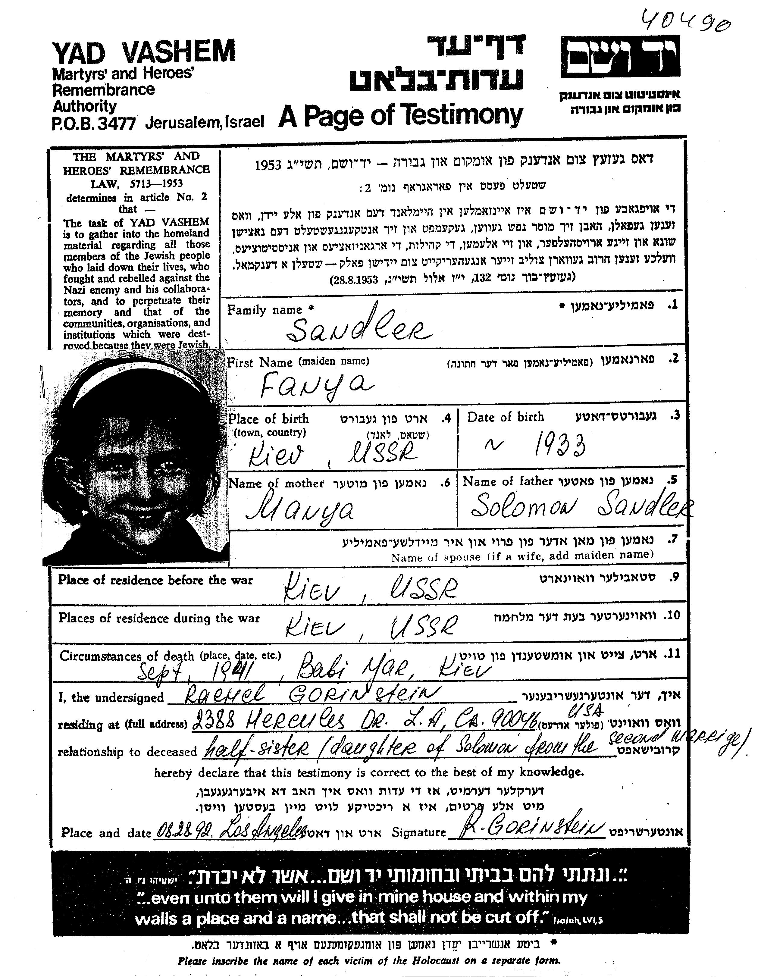Fania Faiga Sandler wurde im Jahr 1933 geboren. Vor dem Zweiten Weltkrieg lebte sie in Kiev, Ukraine (UdSSR).