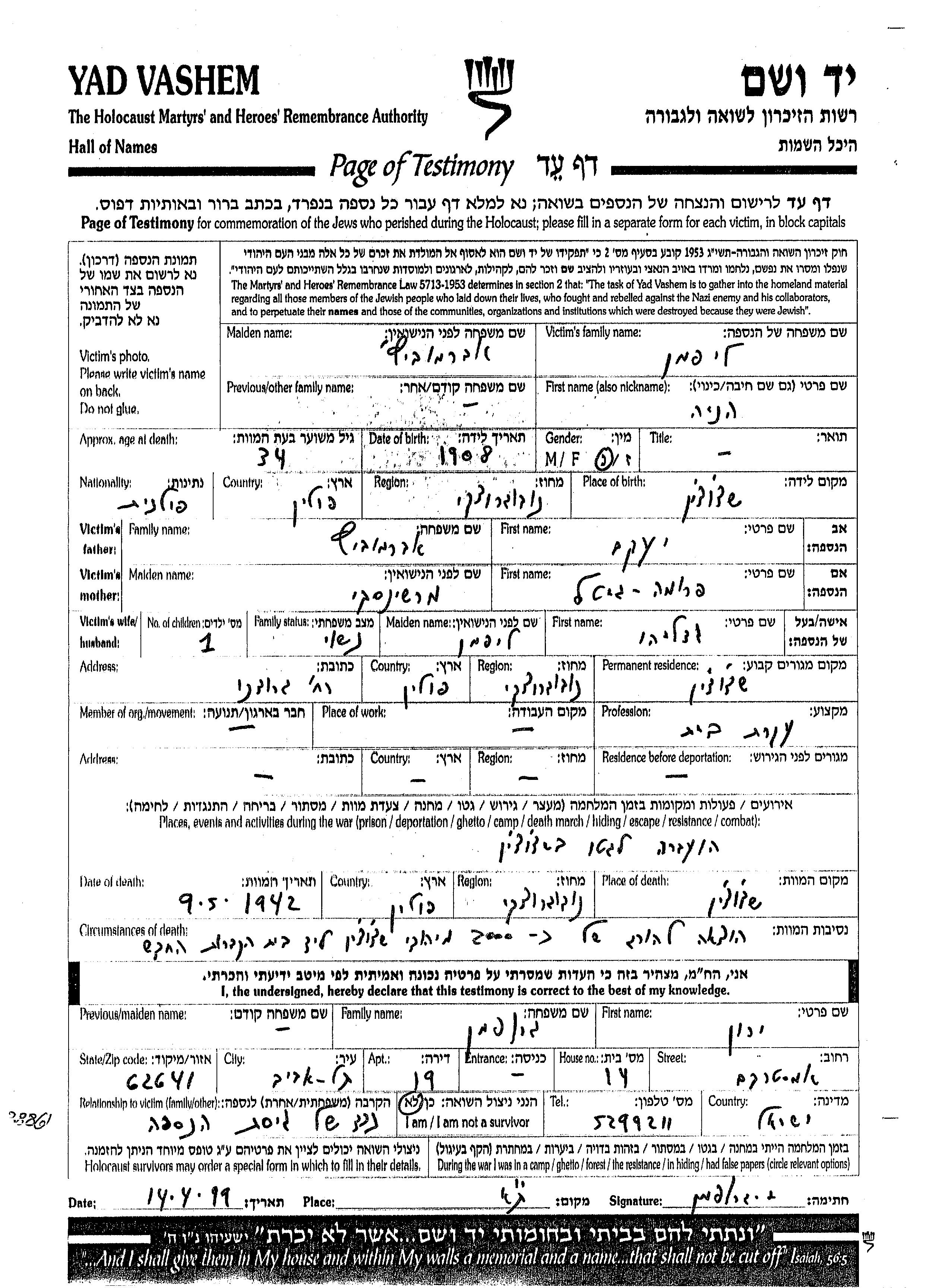 Henia Lipman, geb. Abramovich wurde im Jahr 1908 in Szczuczyn, Polen geboren. Sie war Hausfrau. Vor dem Zweiten Weltkrieg lebte sie in Szczuczyn, Polen.
