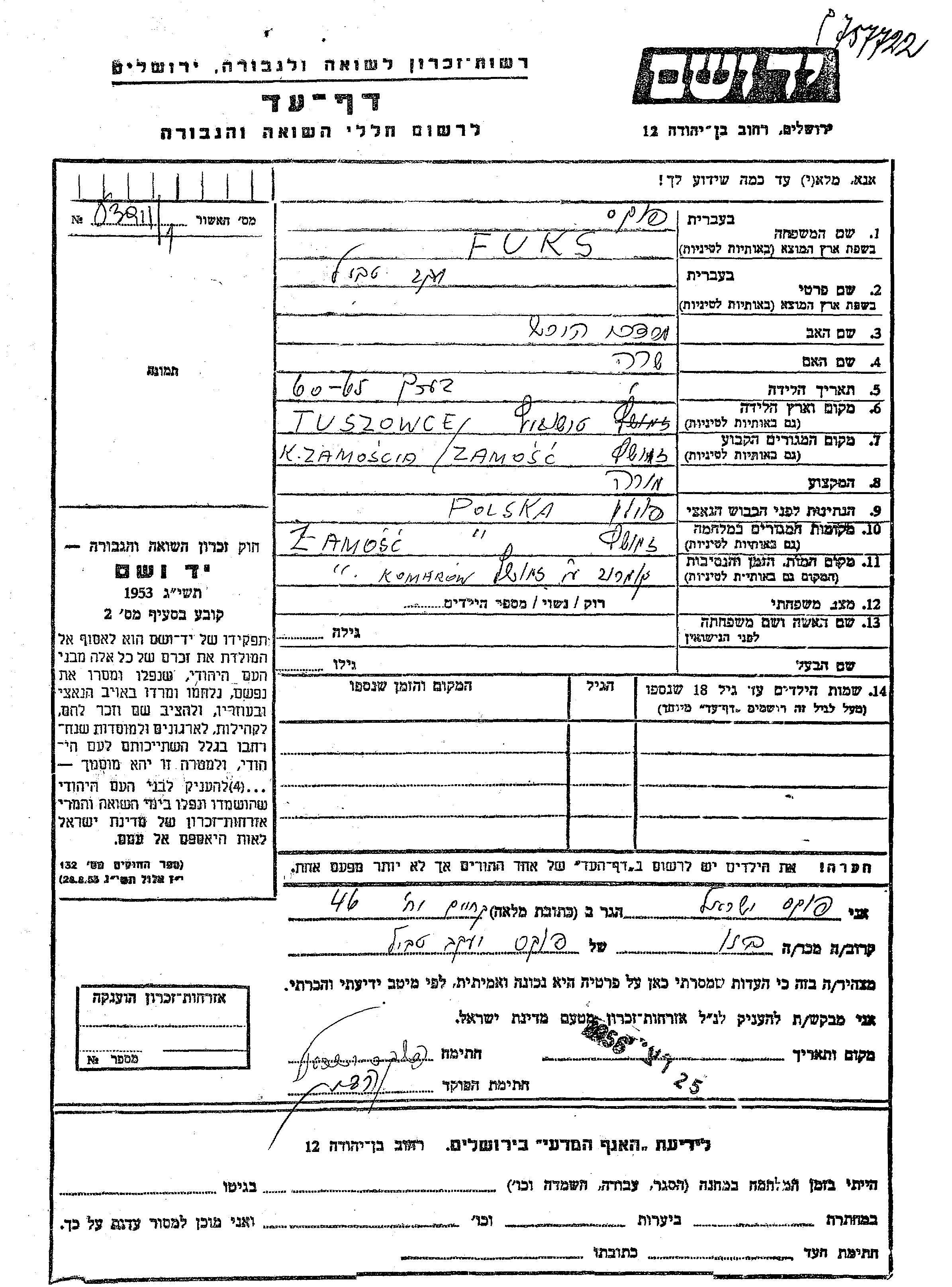 Yaakov Tevel Fuks wurde im Jahr 1877 geboren. Vor dem Zweiten Weltkrieg lebte er in Zamosc, Polen.