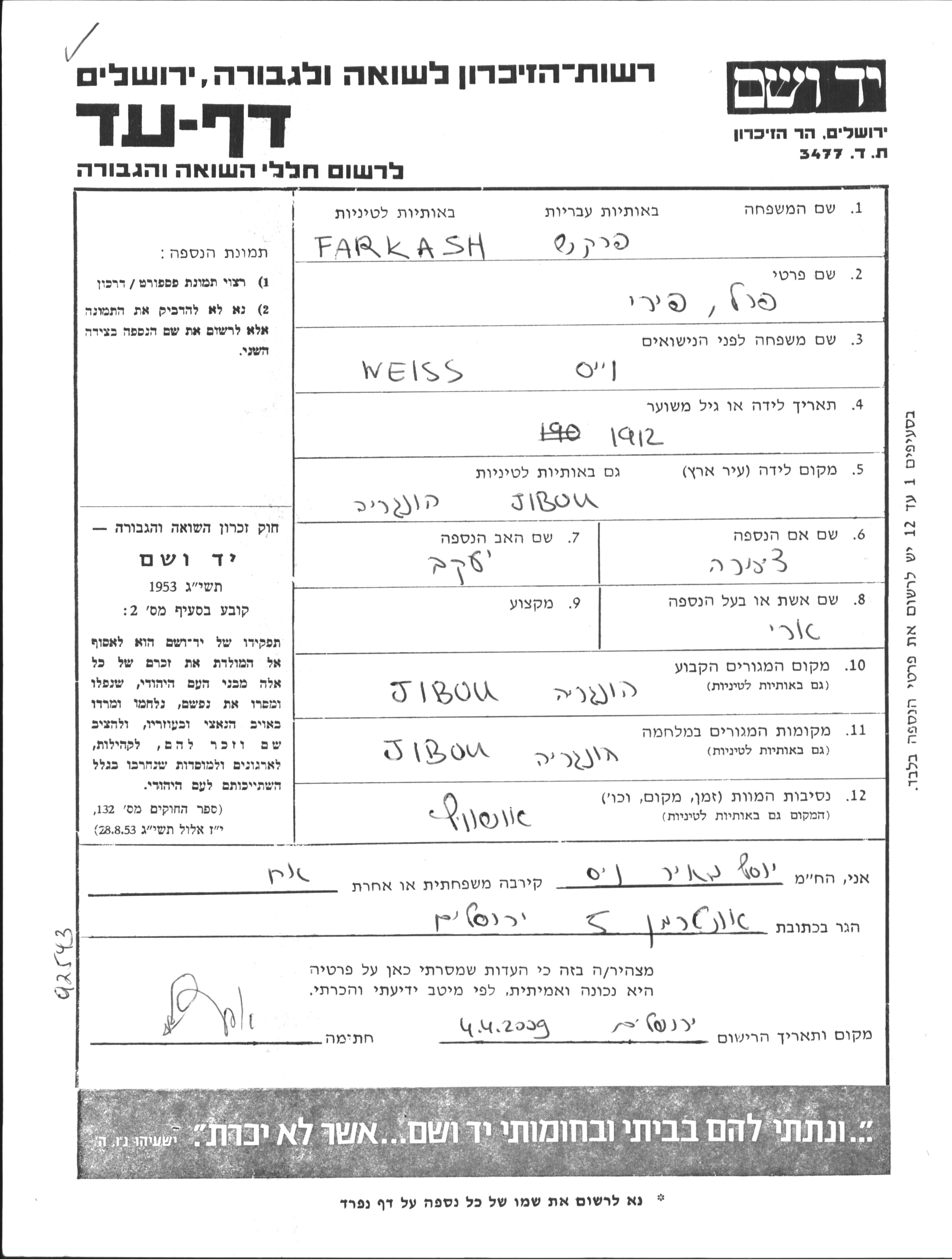 Perel Piri Farkash, geb. Weiss wurde im Jahr 1912 in Jibou, Rumänien geboren. Vor dem Zweiten Weltkrieg lebte sie in Jibou, Rumänien.