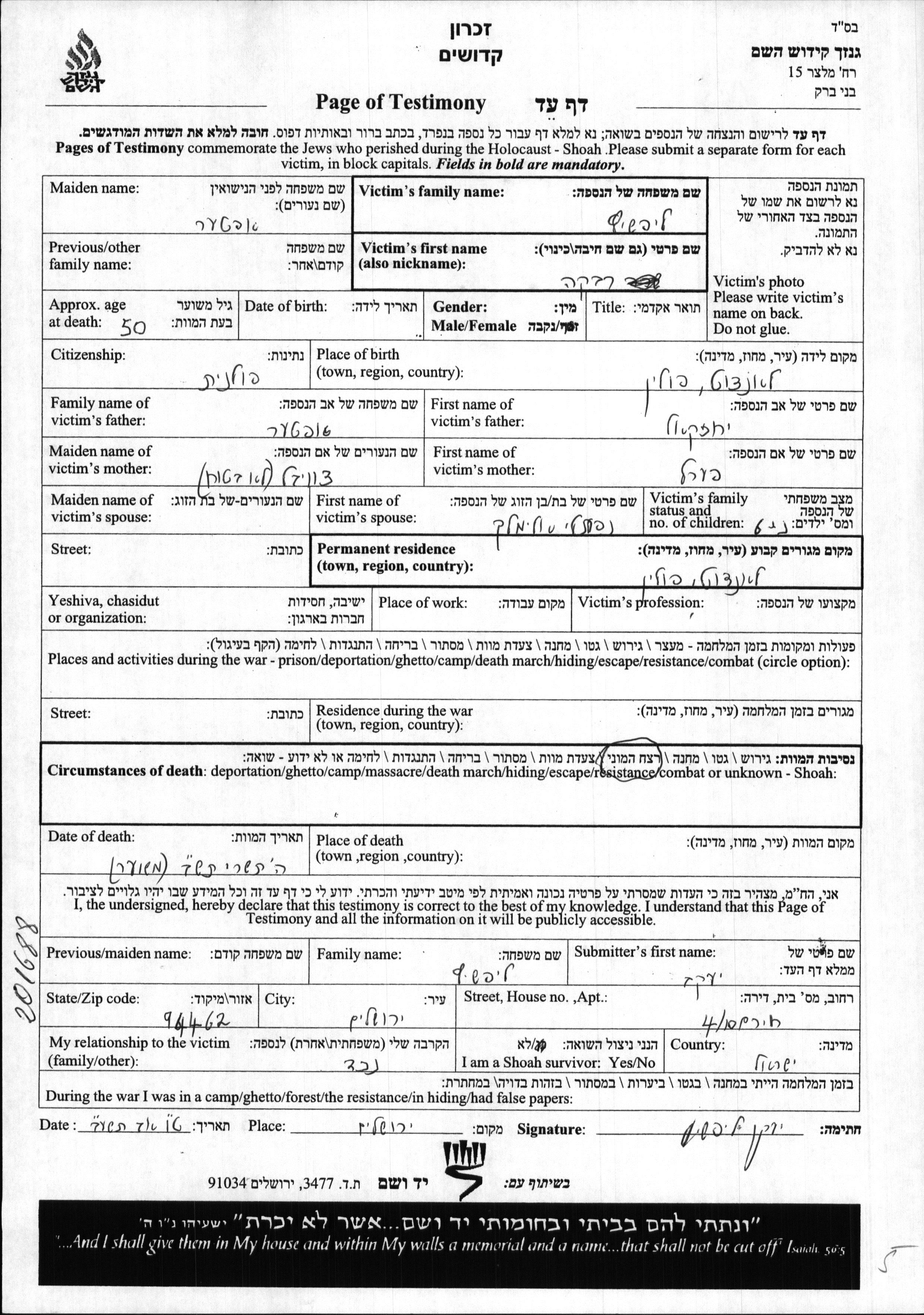 Rivka Lipschitz, geb. Apter wurde in Lancut, Polen geboren. Sie war Hausfrau. Vor dem Zweiten Weltkrieg lebte sie in Lancut, Polen.