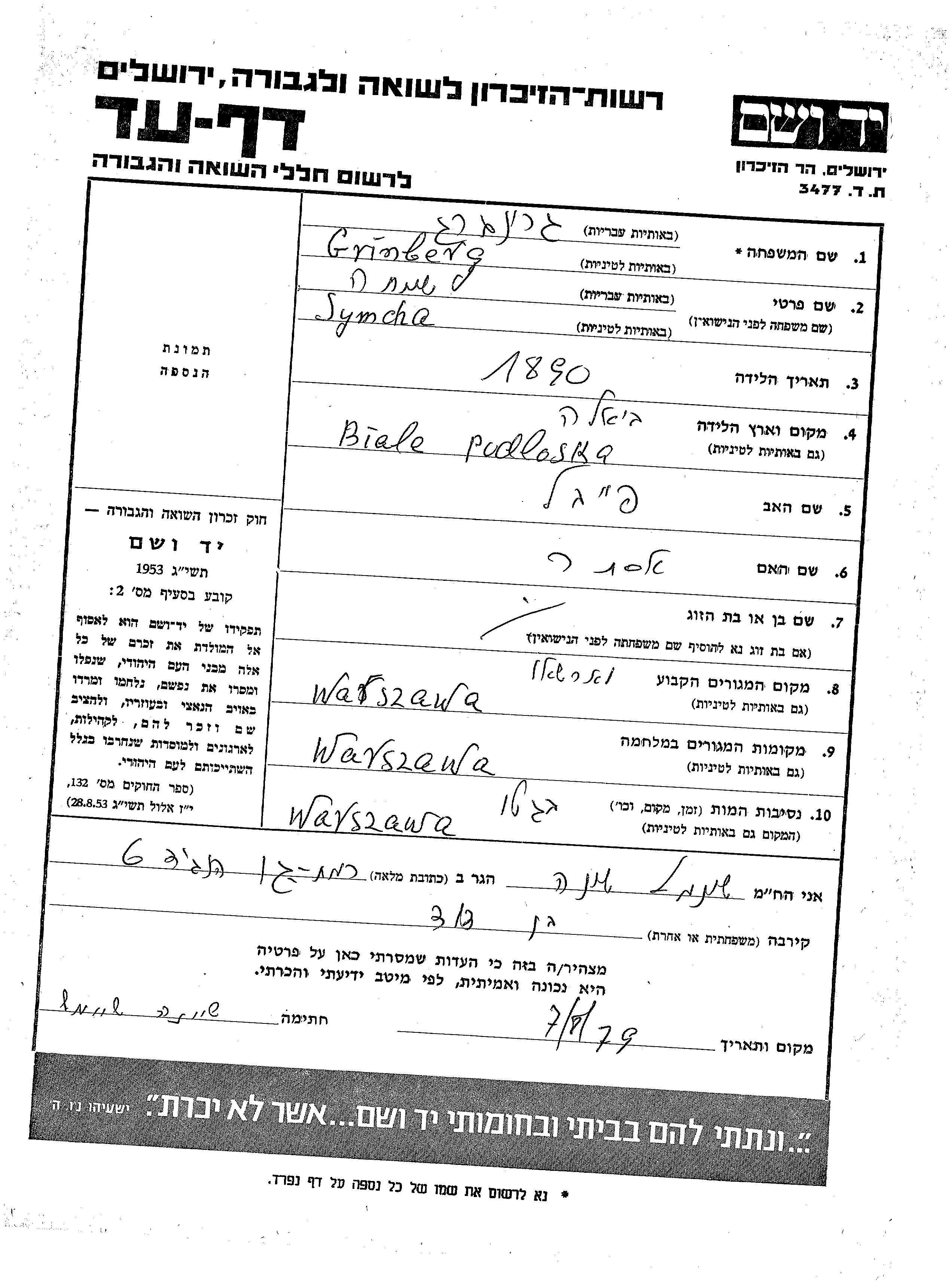 Simkha Grinberg wurde im Jahr 1890 geboren. Er war Kaufmann/-frau. Vor dem Zweiten Weltkrieg lebte er in Varsha, Polen.