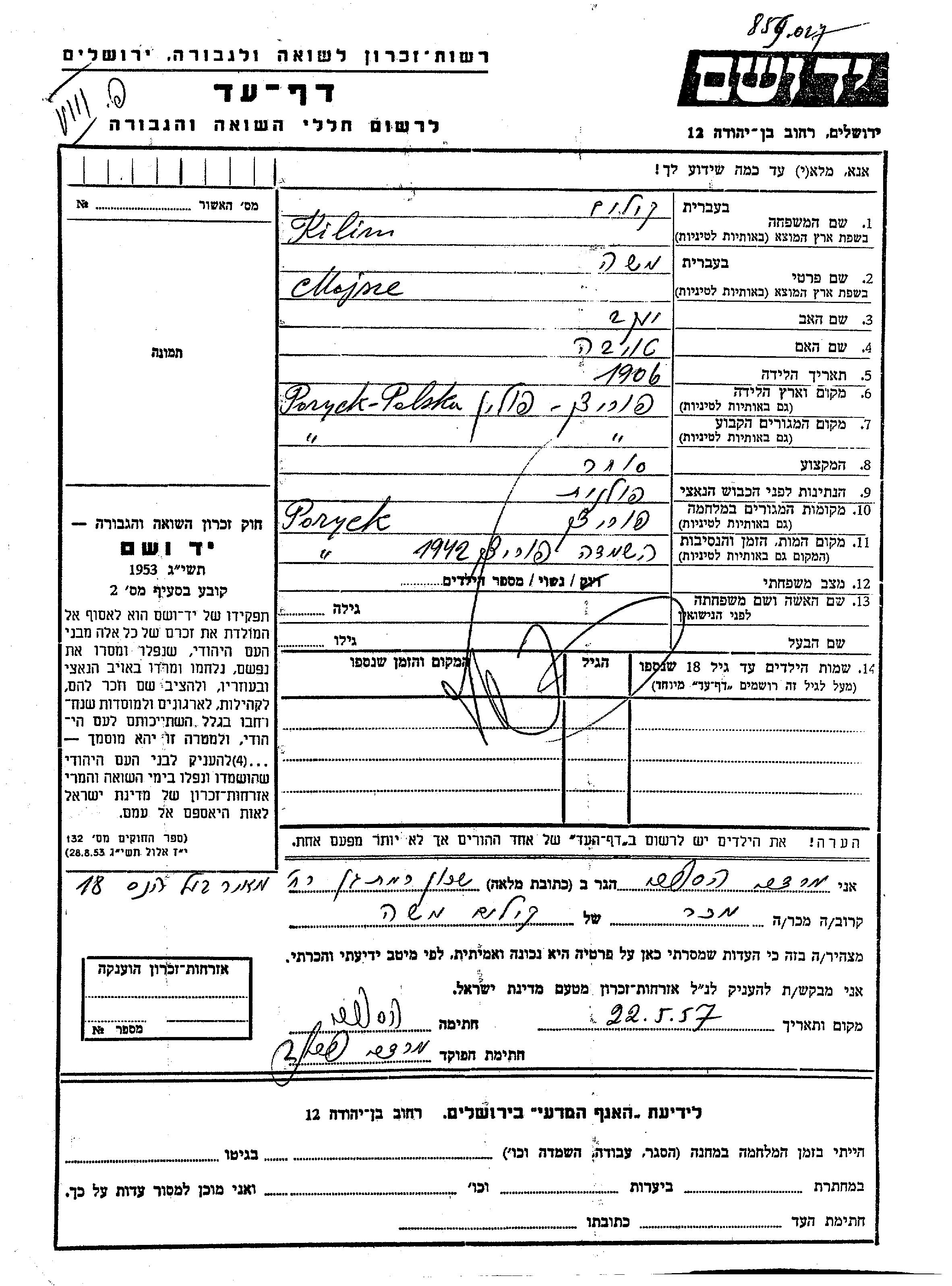 Moshe Kilim wurde im Jahr 1906 in Poryck, Polen geboren. Er war Kaufmann/-frau. Vor dem Zweiten Weltkrieg lebte er in Poryck, Polen.