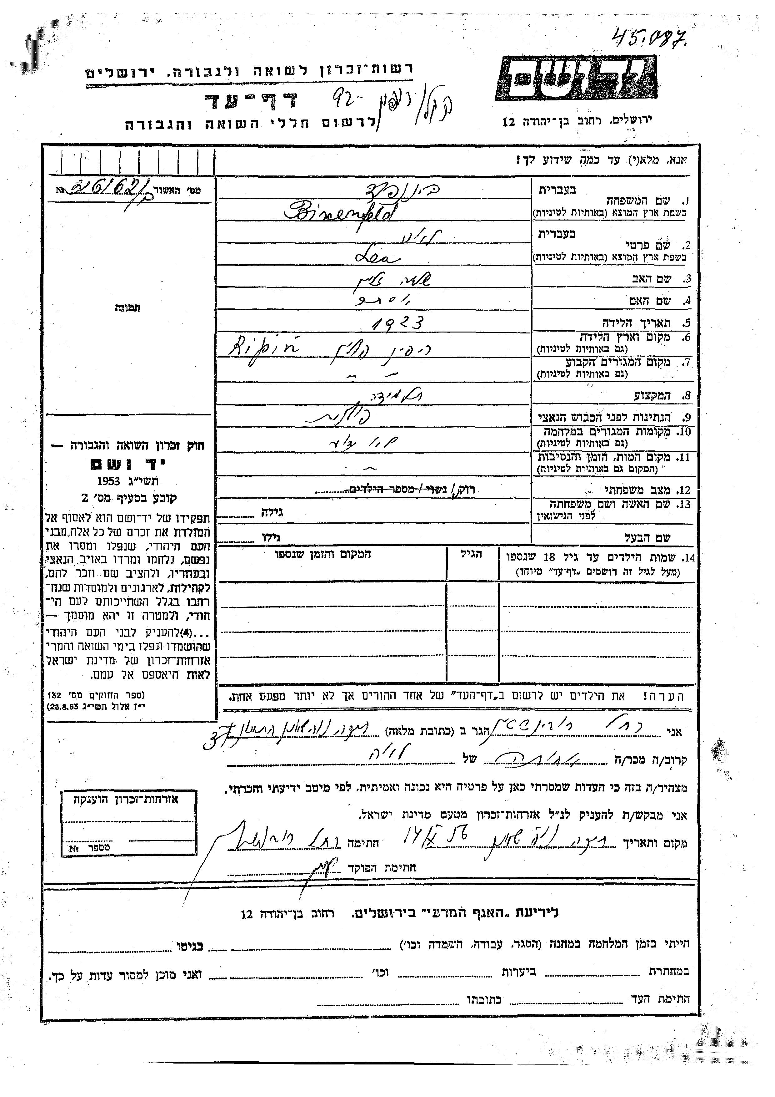 Lea Binenfeld wurde im Jahr 1923 in Ripin, Polen geboren. Sie war die Tochter von Shlomo Zalman und Ester. Sie war Schüler/-in und Ledig. Vor dem Zweiten Weltkrieg lebte sie in Ripin, Polen.