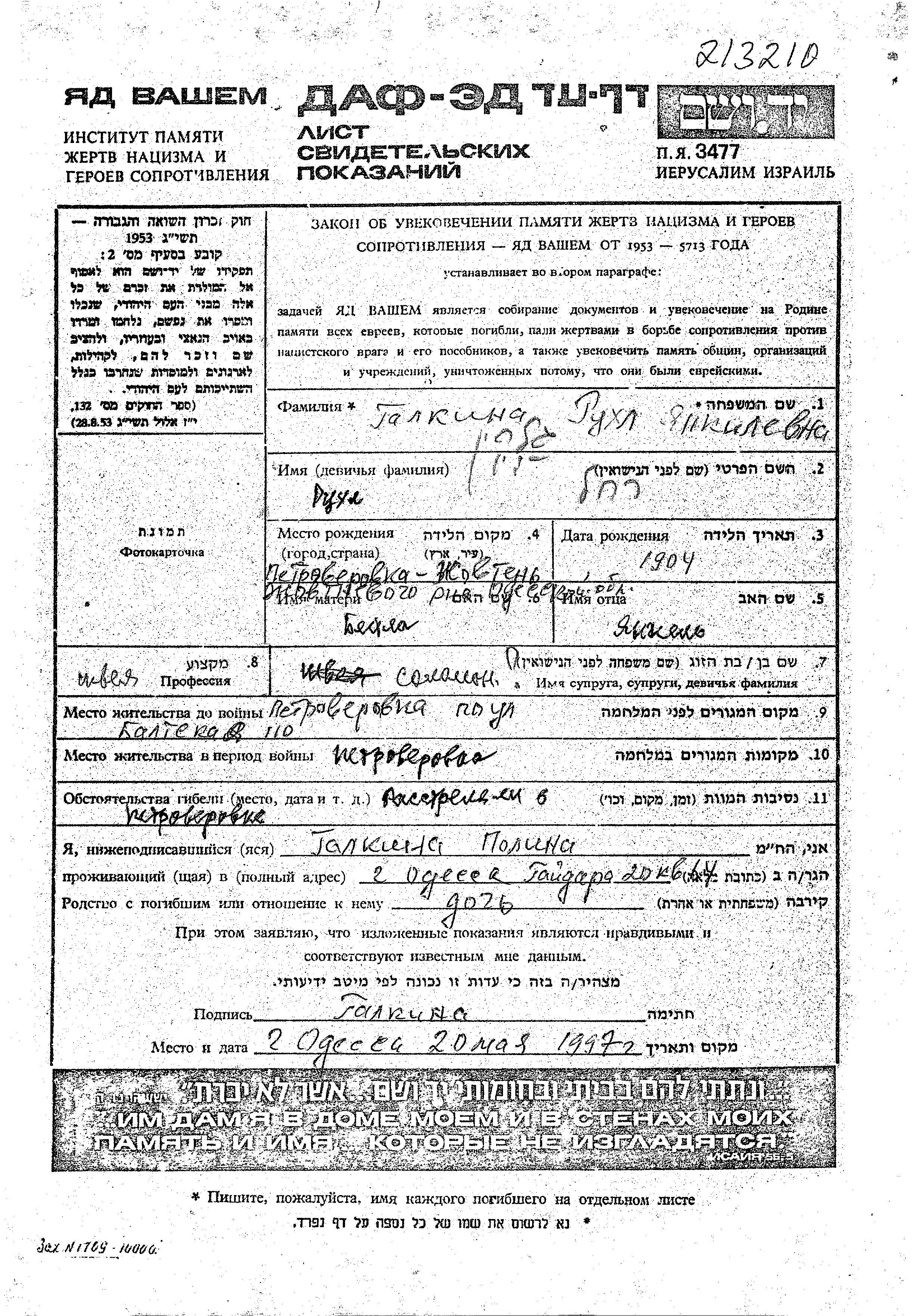 Rakhel Galkin wurde im Jahr 1904 in Petroverovka, Ukraine (UdSSR) geboren. Vor dem Zweiten Weltkrieg lebte sie in Petroverovka, Ukraine (UdSSR).