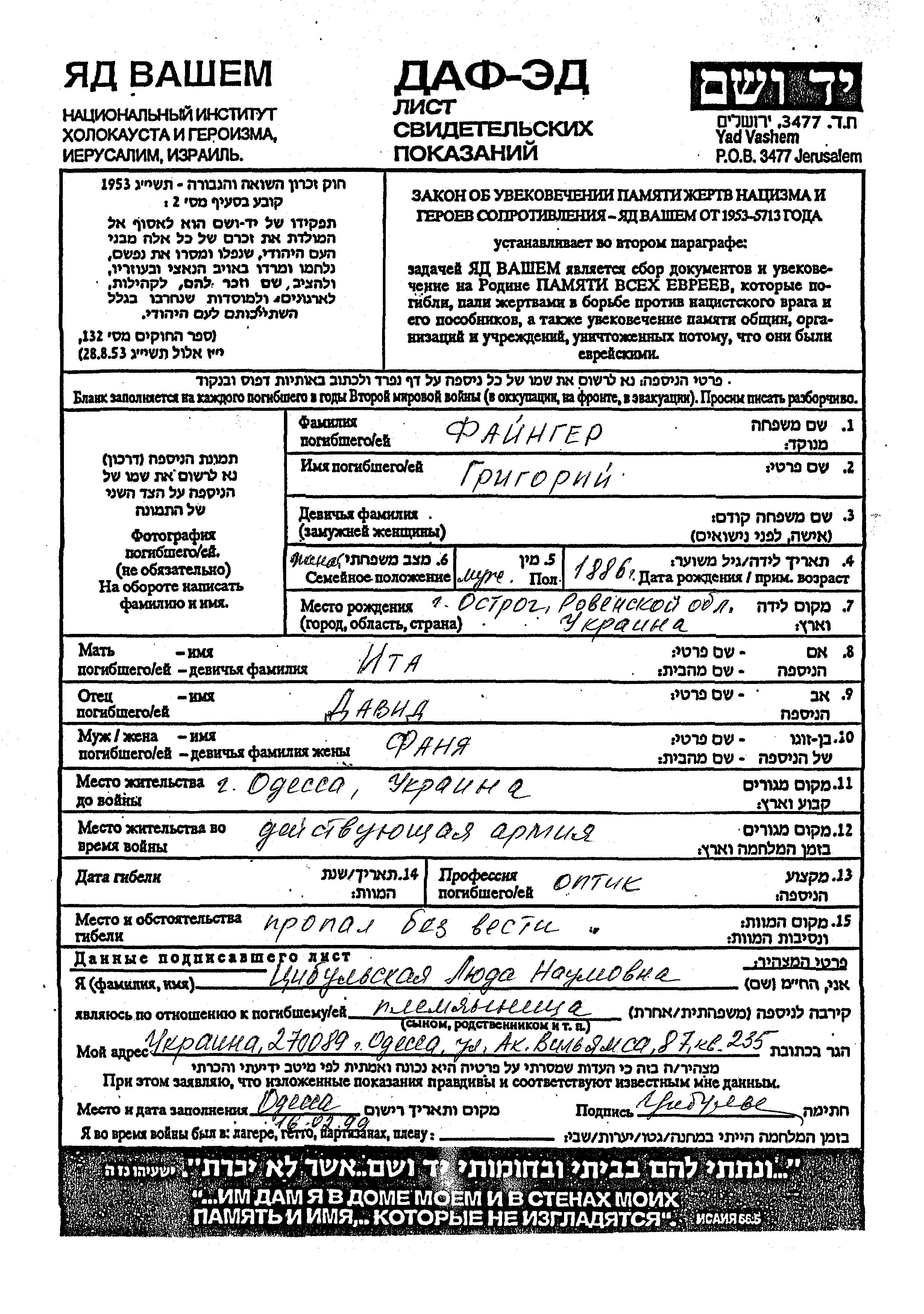 Faynger | Grigori | 1886 | Odessa, Ukraine (UdSSR) | Verfolgtenliste |