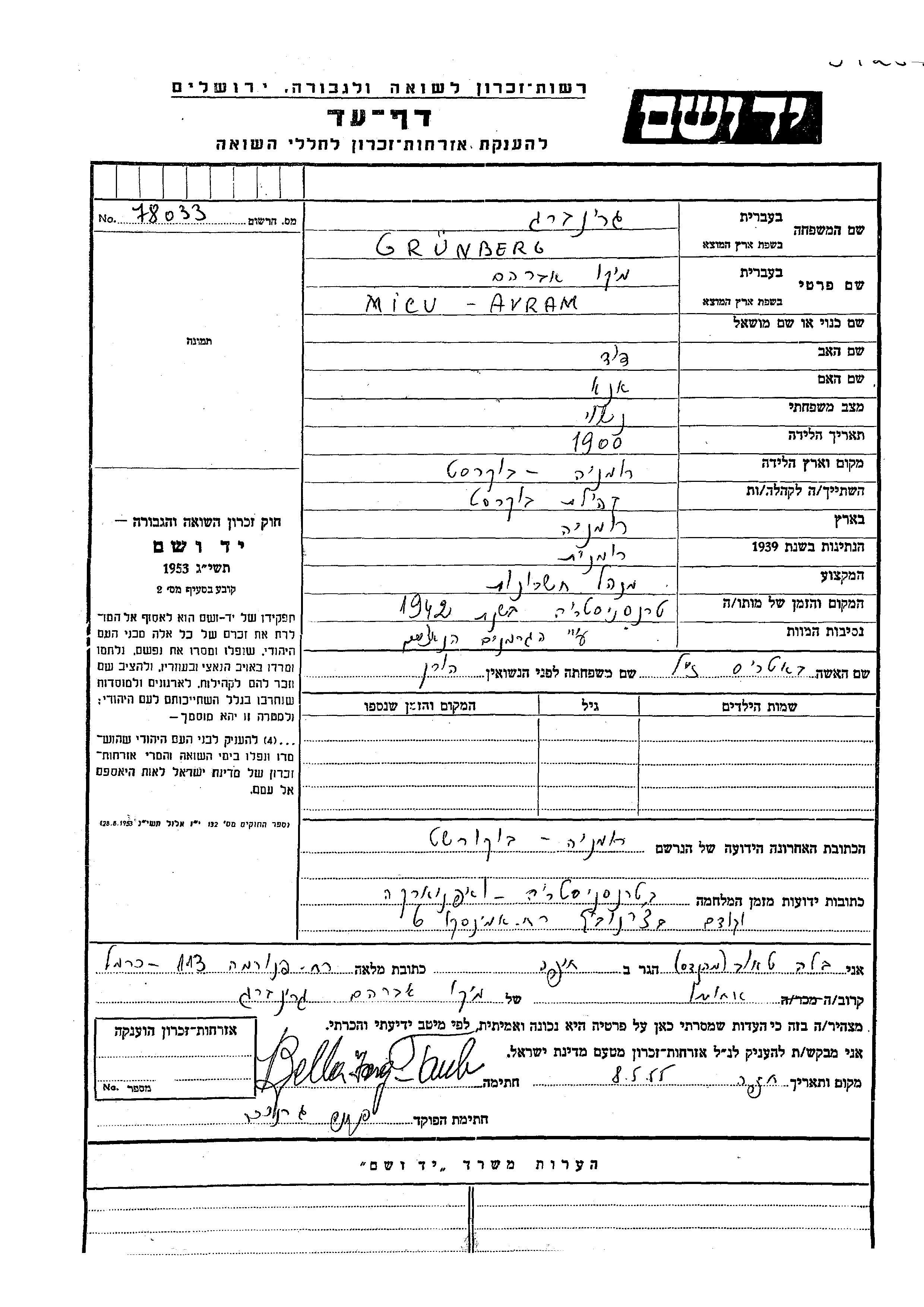 Micu Miko Avraham Grünberg wurde im Jahr 1900 geboren. Vor dem Zweiten Weltkrieg lebte er in Bucuresti, Rumänien.