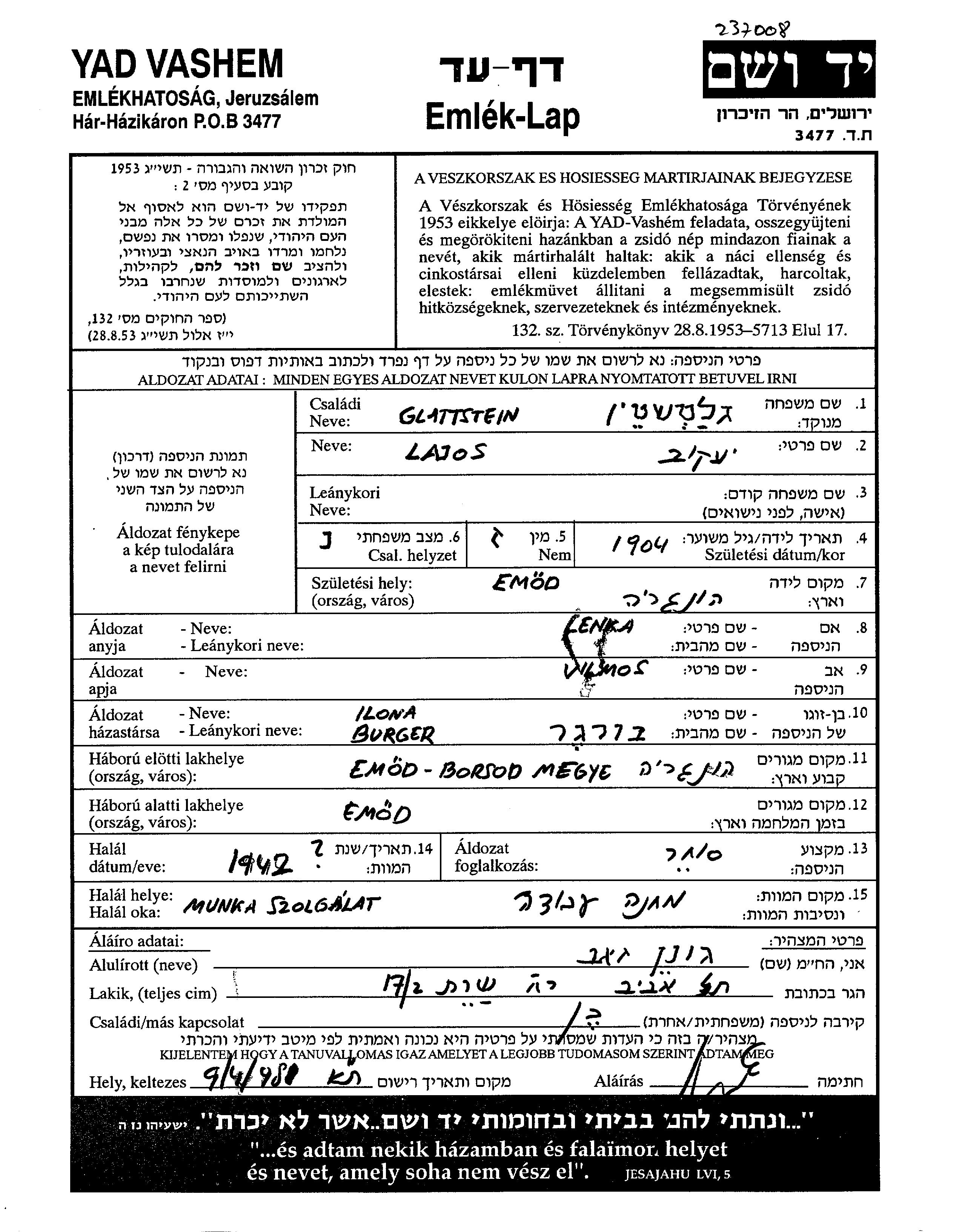 Glattstein Lajos 1902 Emod, Ungarn Liste von ermordeten Personen