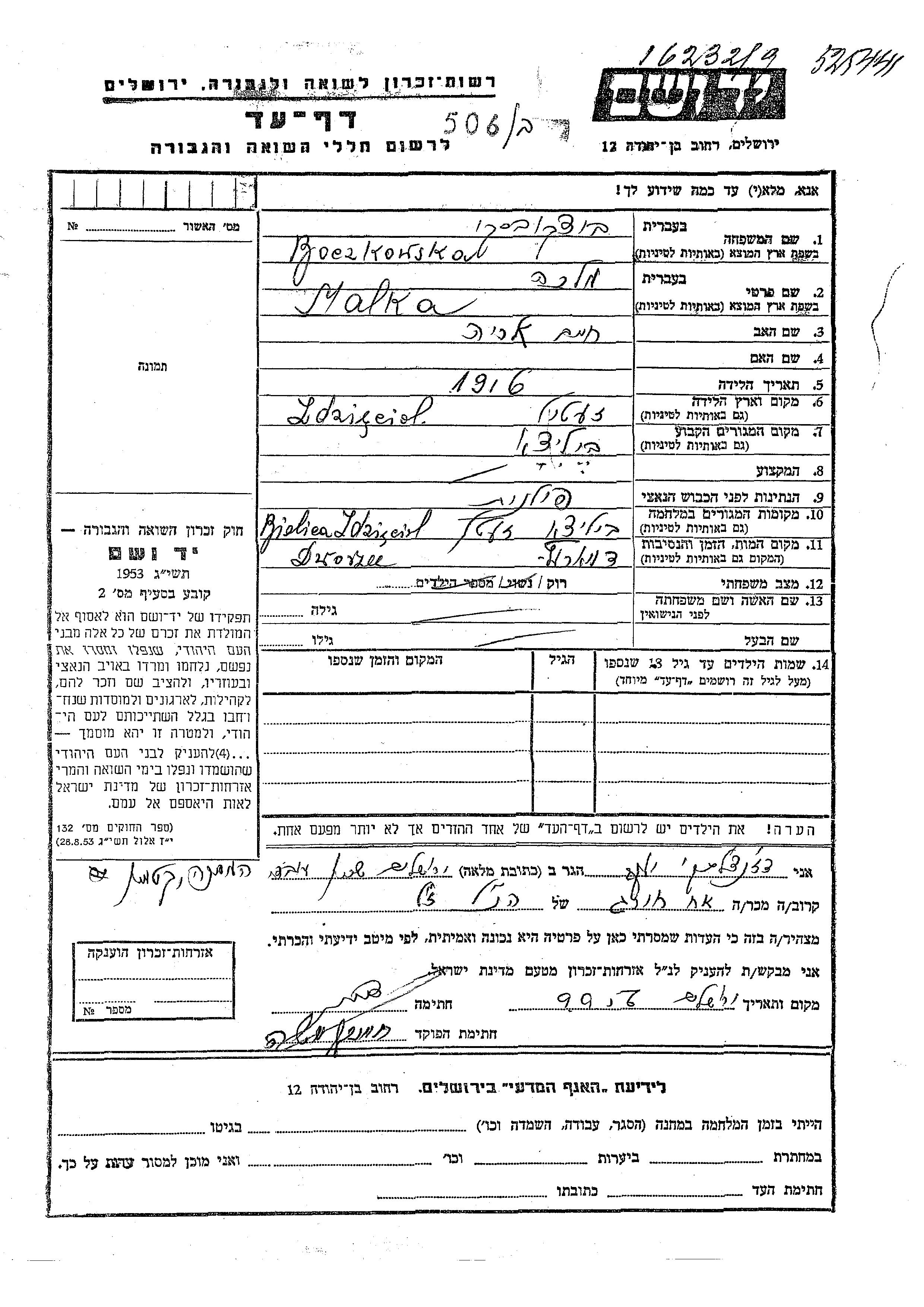 Malka Boczkowska wurde im Jahr 1916 geboren. Sie war die Tochter von Khaim Arie. Sie war Ledig. Während des Krieges war sie in Bielica, Polen.