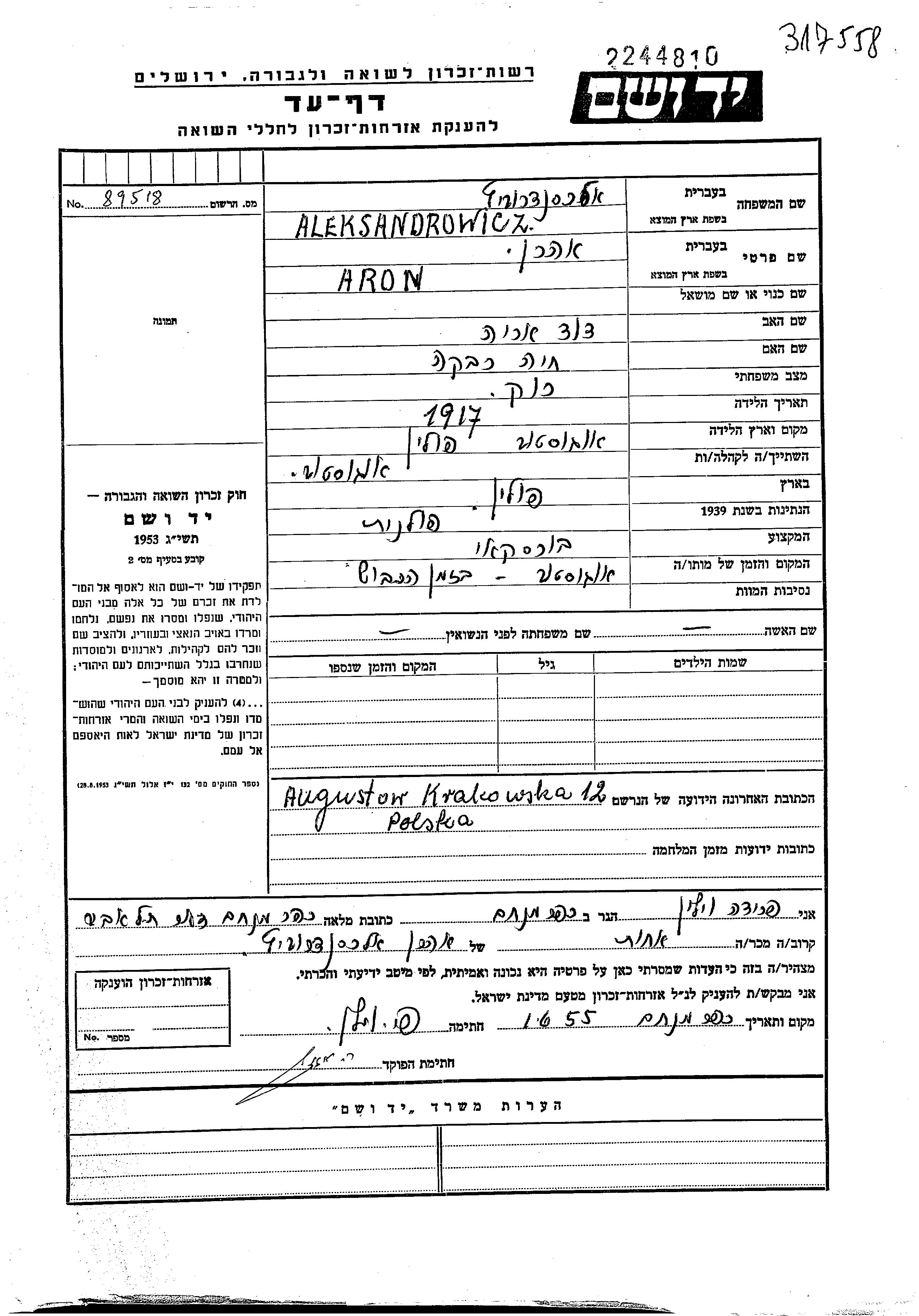 Aleksandrowicz | Aron | 1917 | Augustów, Polen | Gedenkblatt |