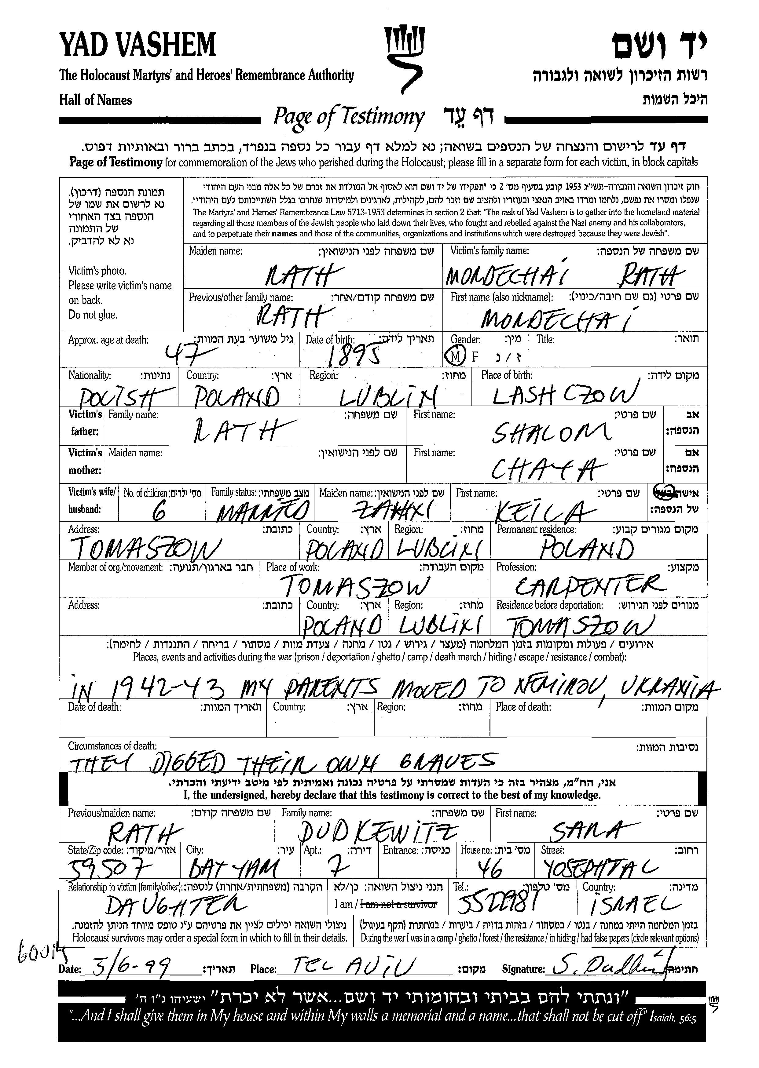 Motel Rath wurde im Jahr 1895 geboren. Er war Zimmermann. Vor dem Zweiten Weltkrieg lebte er in Tomaszow, Polen.