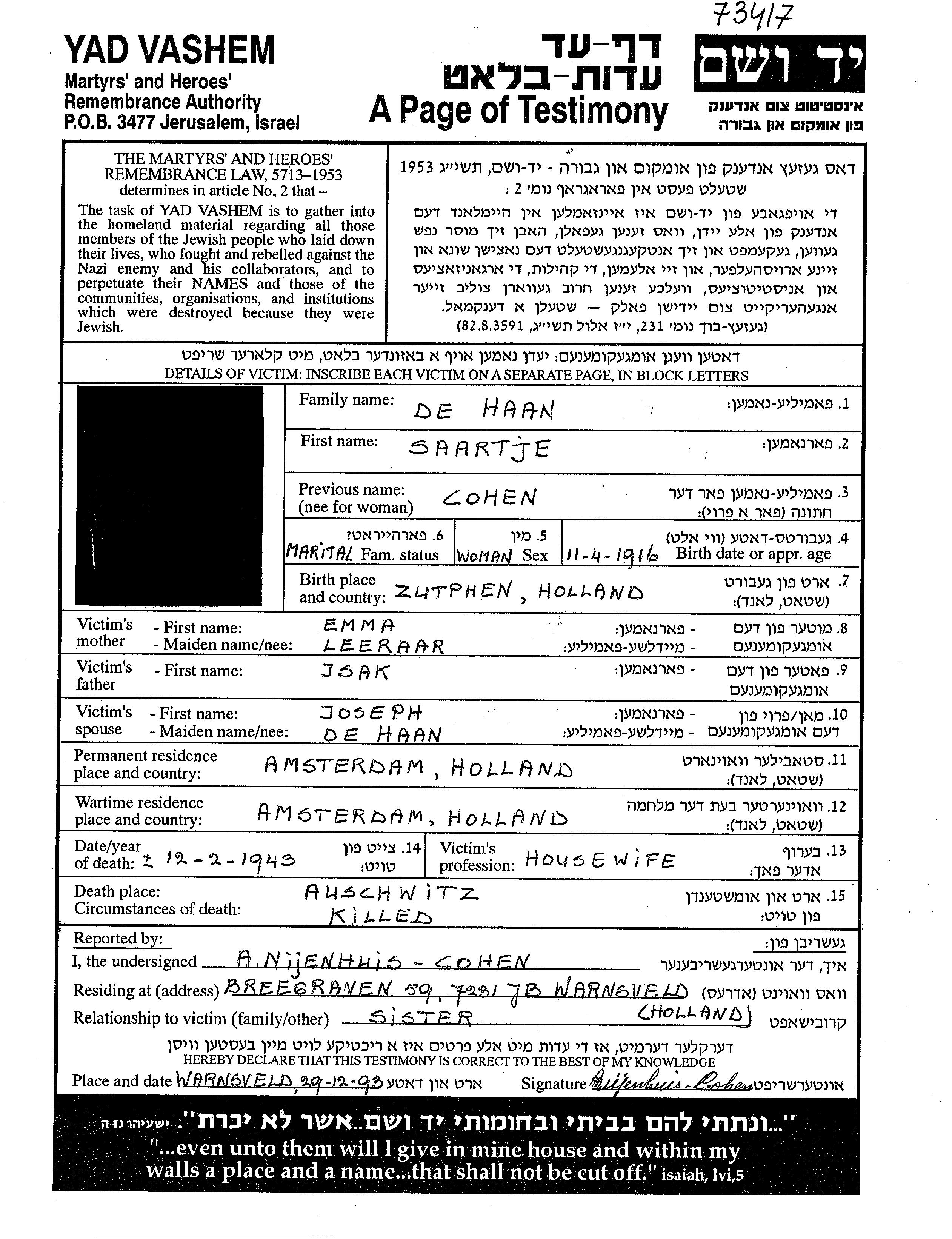 Saartje Haan de, geb. Cohen wurde im Jahr 1916 in Zutphen, Niederlande geboren. Sie war Hausfrau. Vor dem Zweiten Weltkrieg lebte sie in Amsterdam, Niederlande.
