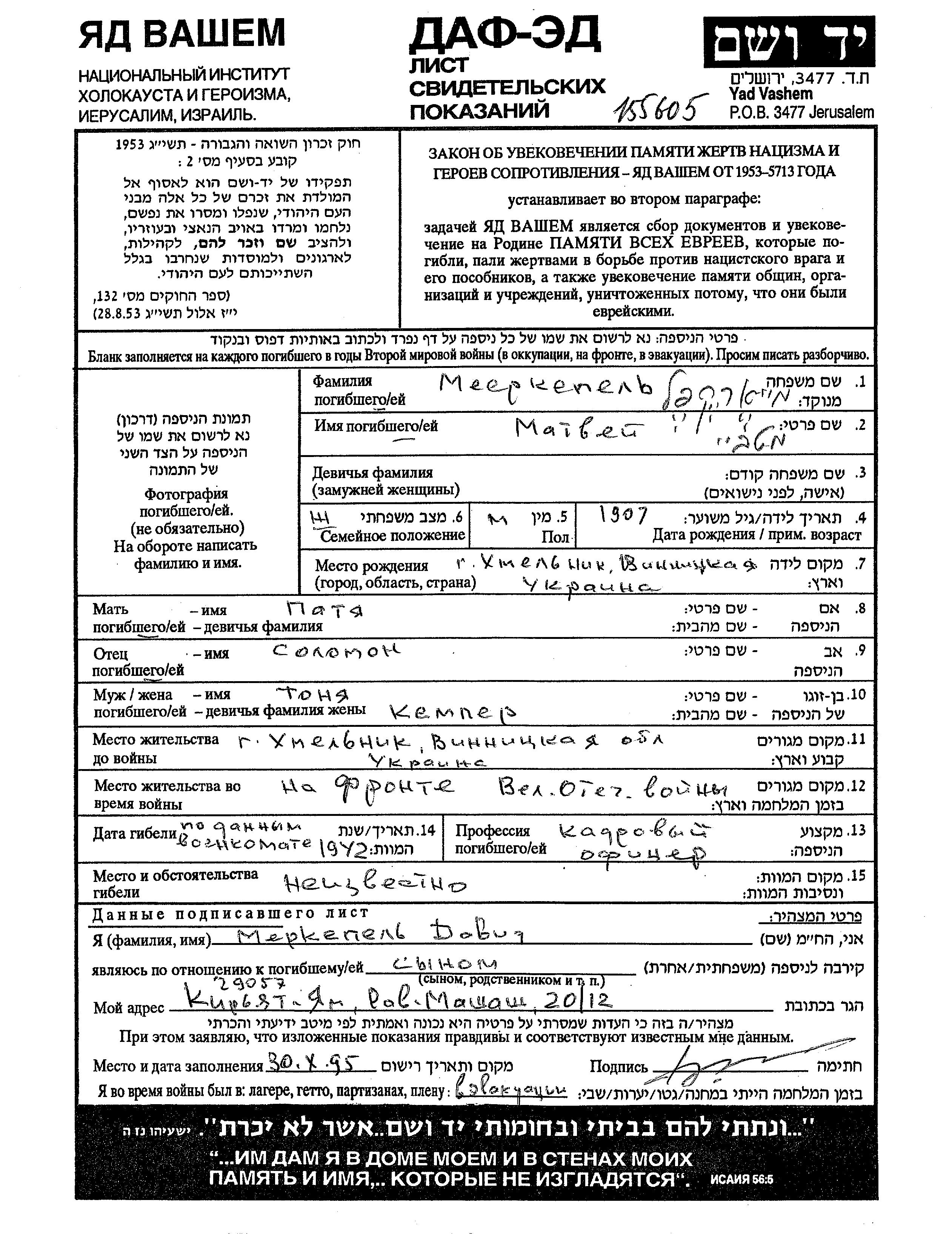 Matvei Motl Meyerkepel wurde im Jahr 1907 in Khmelnik, Ukraine (UdSSR) geboren. Er war Offizier. Vor dem Zweiten Weltkrieg lebte er in Khmelnik, Ukraine (UdSSR).