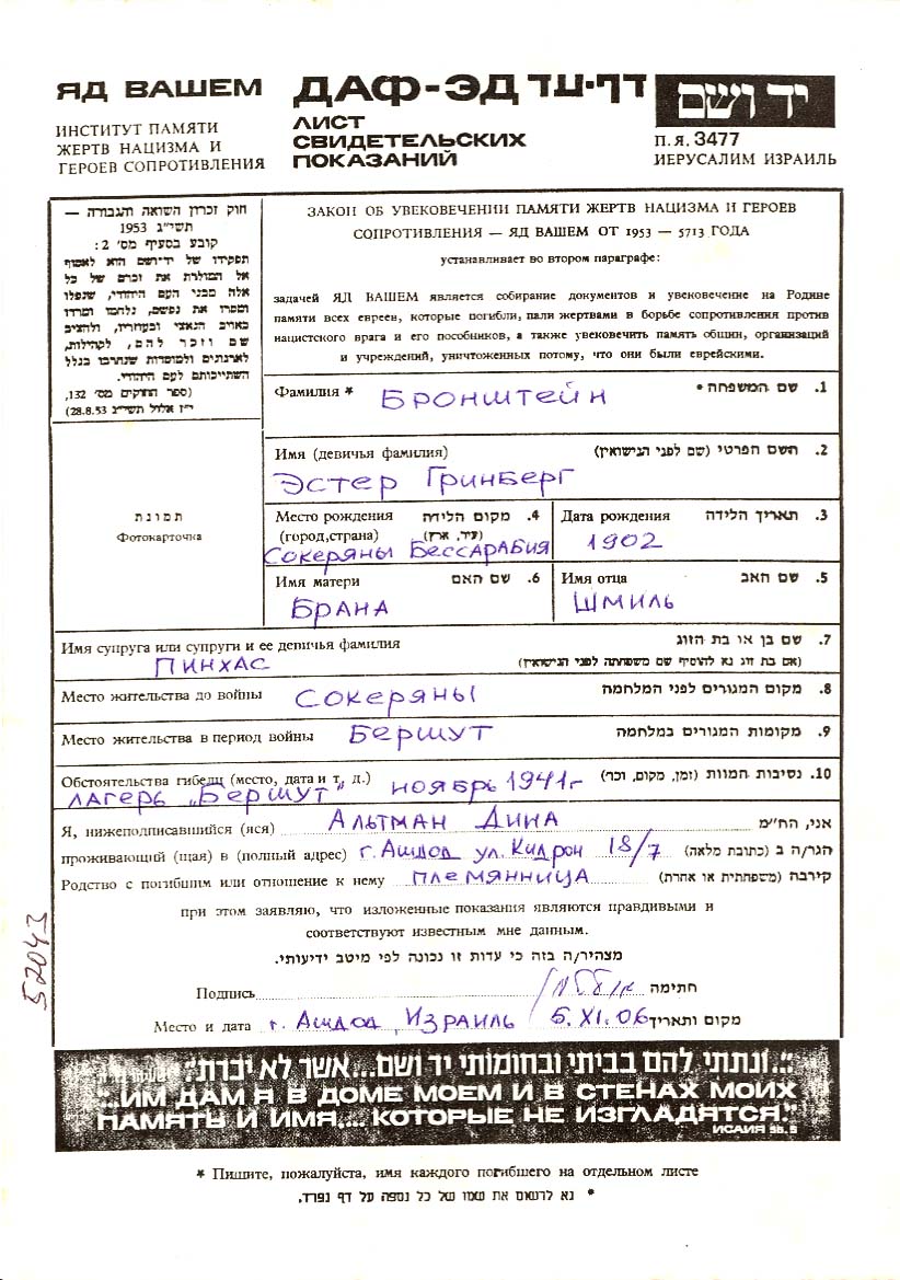 Bronshtein | Ester | 1902 | Secureni, Rumänien | Gedenkblatt |