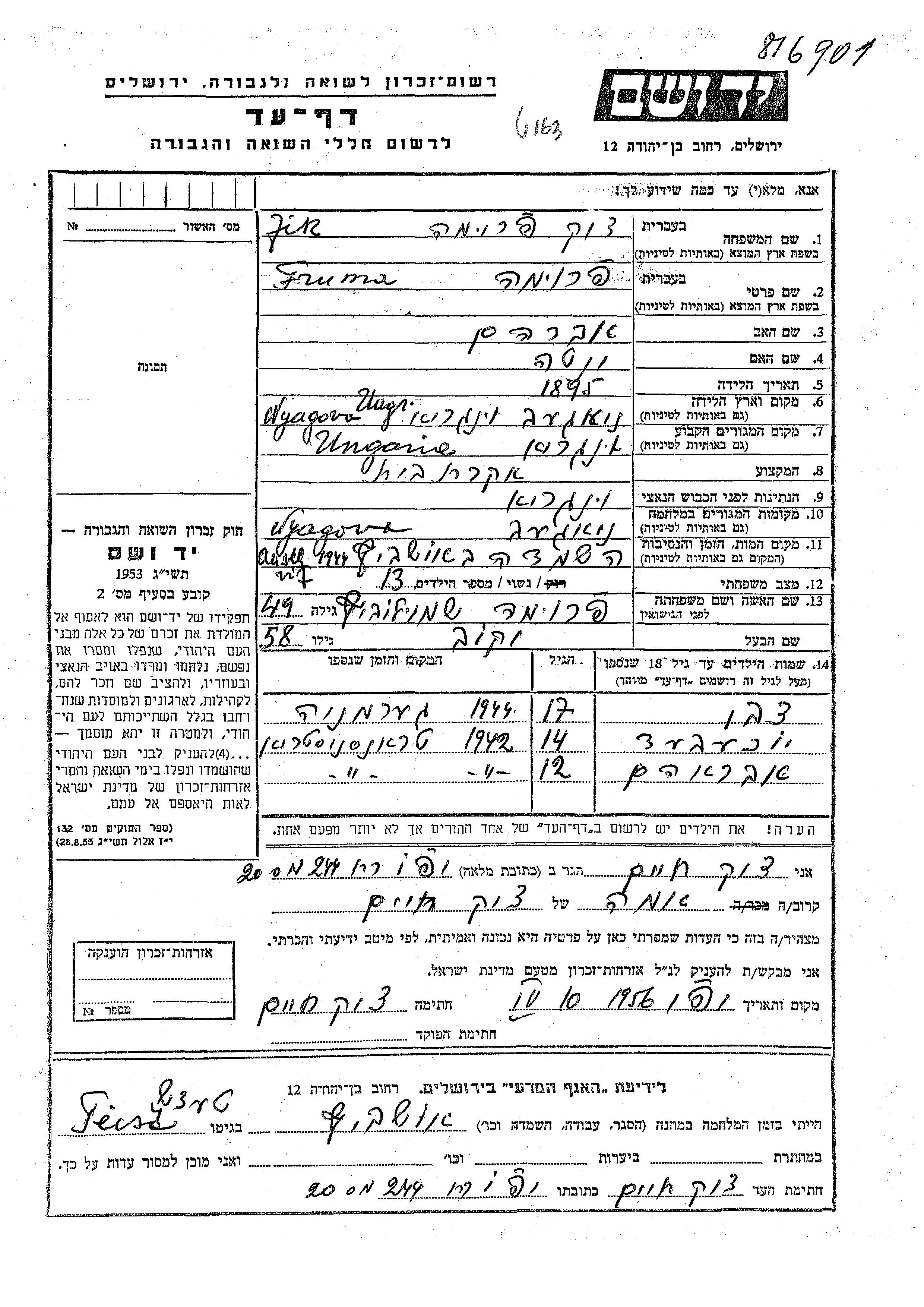 Frimed wurde in der Schoah ermordet. Todesort: Auschwitz, Polen im Jahr 1944.