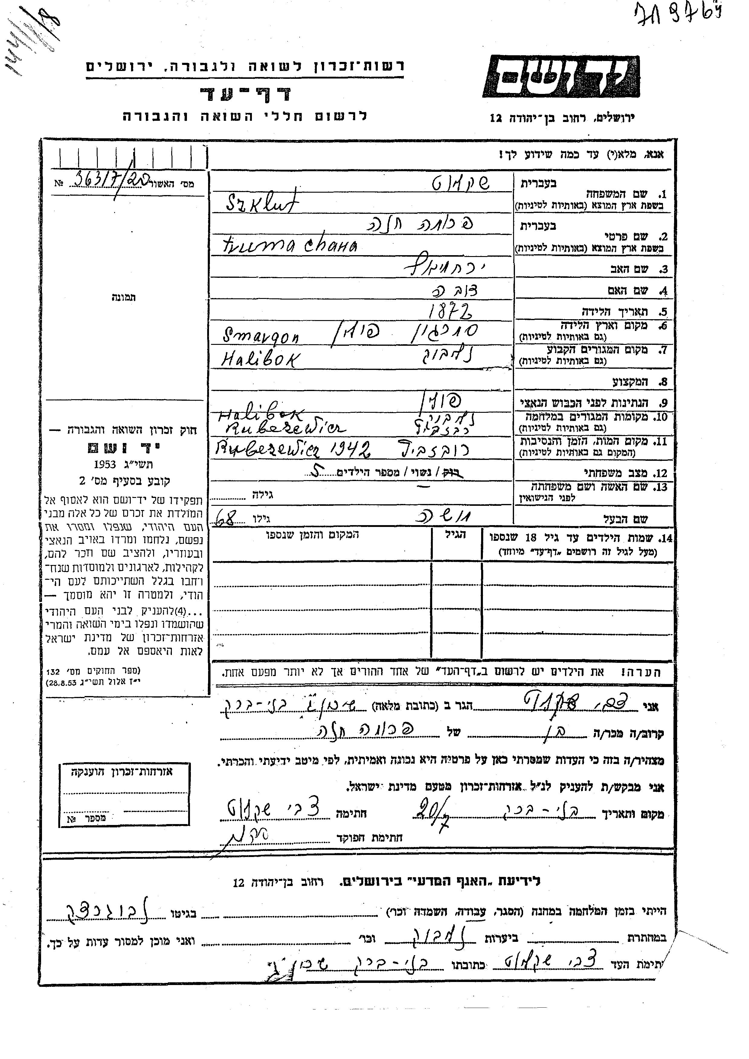 Frume Khana Szklut, geb. Hofman wurde im Jahr 1872 geboren. Sie war Hausfrau. Vor dem Zweiten Weltkrieg lebte sie in Naliboki, Polen.