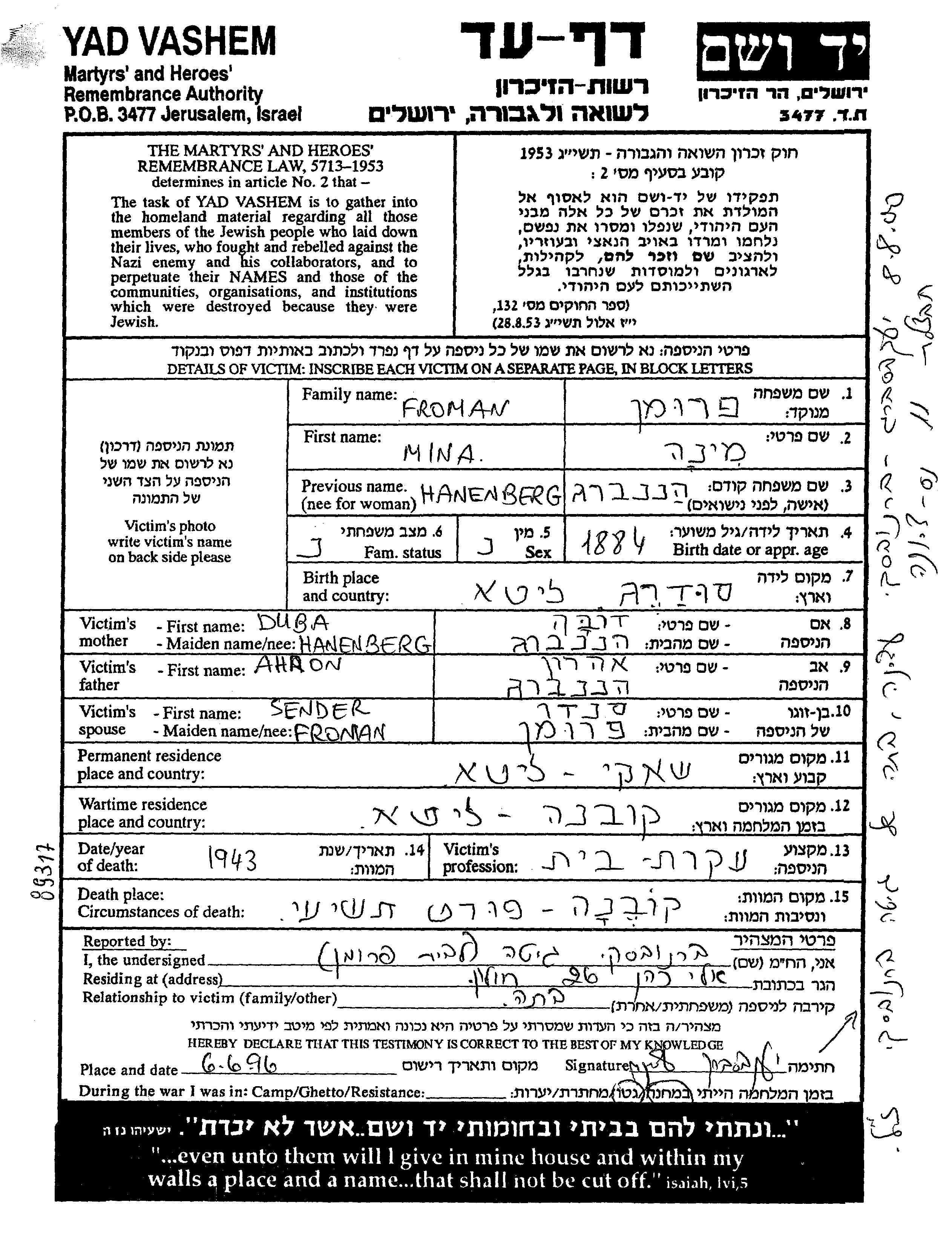 Mina Tzina Froman Fruhman, geb. Hanenberg wurde im Jahr 1884 geboren. Sie war Hausfrau. Vor dem Zweiten Weltkrieg lebte sie in Sakiai, Litauen.