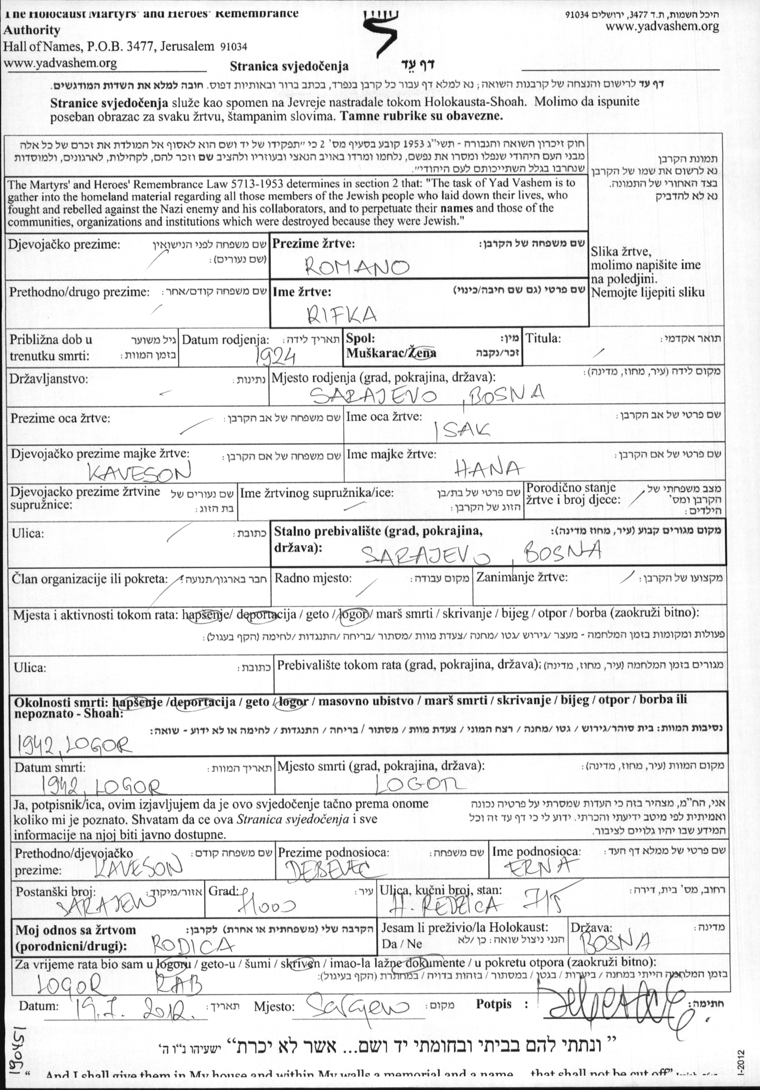 Beba Rivka Romano wurde im Jahr 1924 in Sarajevo, Jugoslawien geboren. Sie war Schneiderin. Vor dem Zweiten Weltkrieg lebte sie in Sarajevo, Jugoslawien.