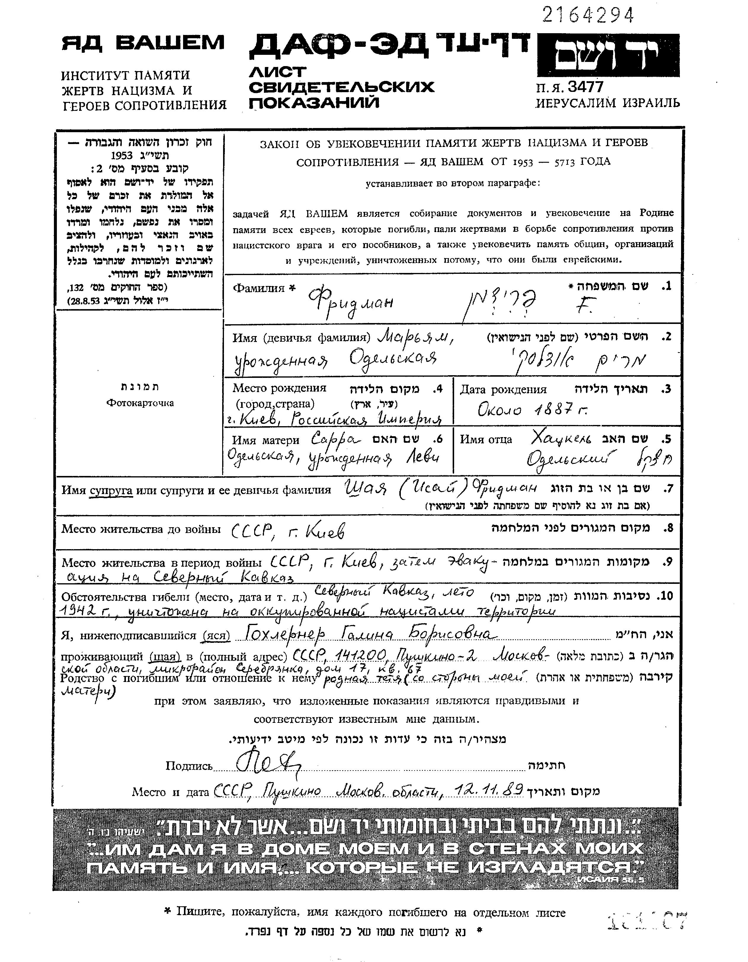Miriam Fridman, geb. Odelski wurde im Jahr 1887 in Kiyev, Ukraine (UdSSR) geboren. Vor dem Zweiten Weltkrieg lebte sie in Kiyev, Ukraine (UdSSR).