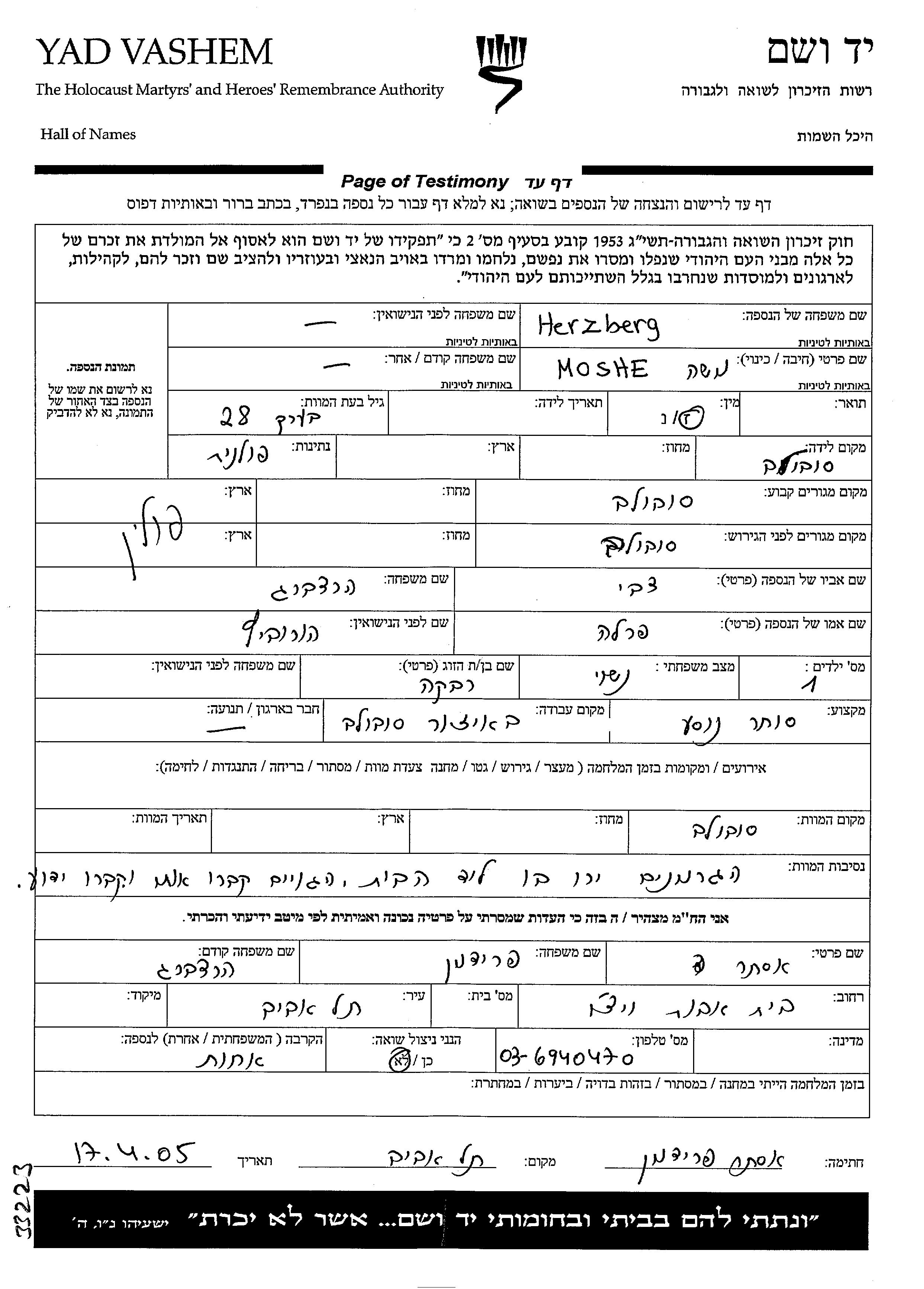 Moshe Herzberg wurde im Jahr 1904 in Sobolew, Polen geboren. Vor dem Zweiten Weltkrieg lebte er in Sobolew, Polen.