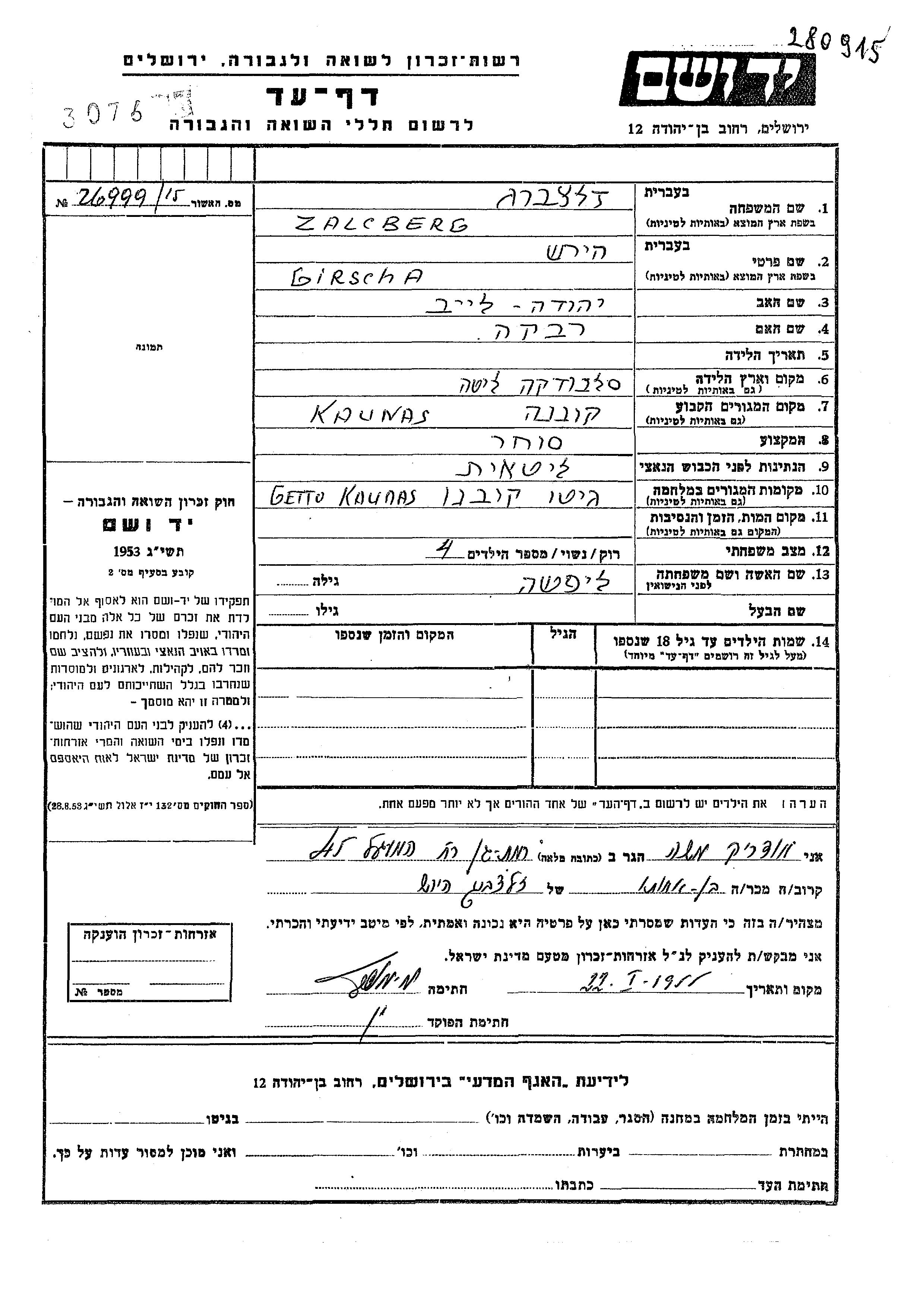 Zalcberg Girscha Kaunas, Litauen Gedenkblatt