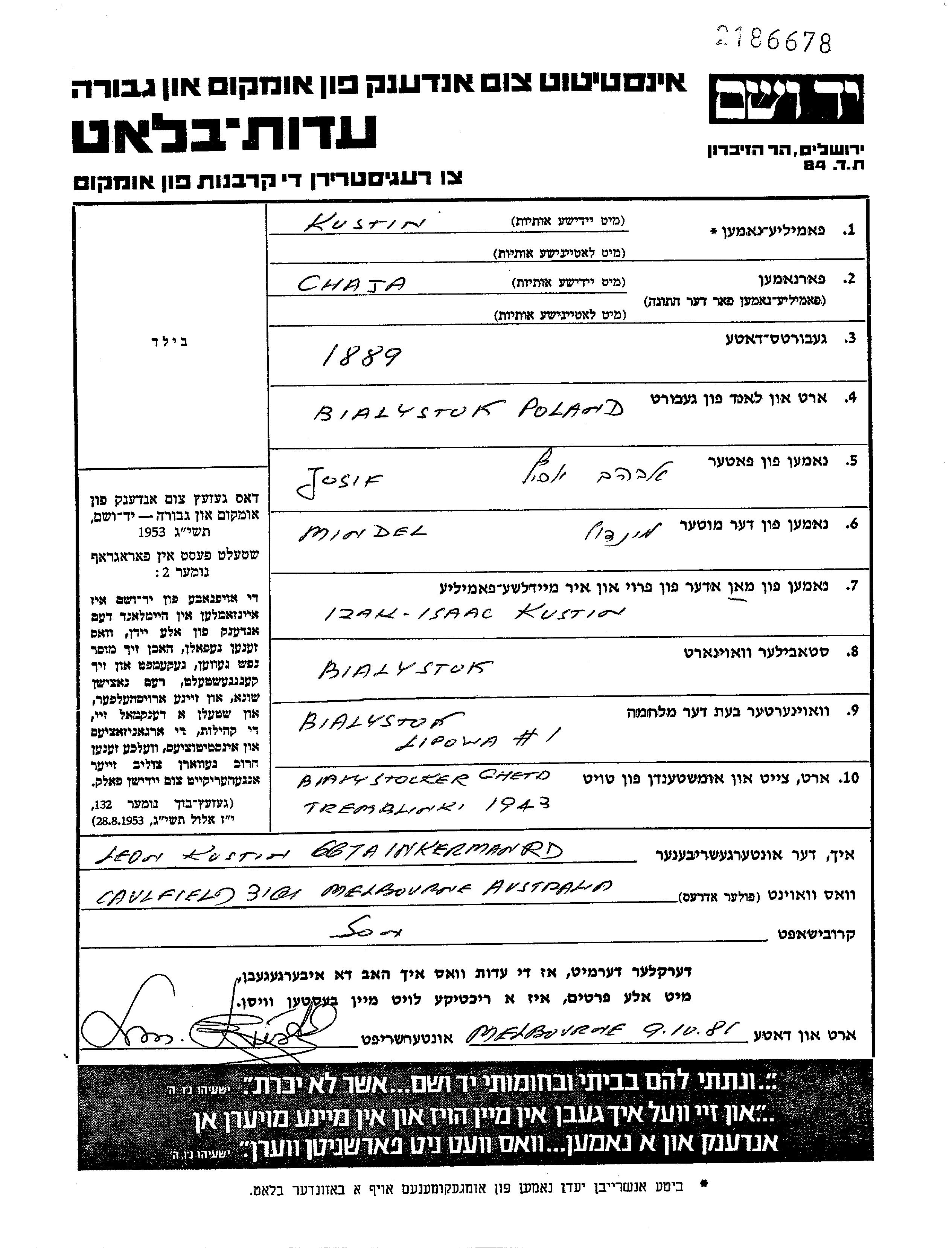 Khaia Kustin, geb. Snyder wurde im Jahr 1889 in Bialystok, Polen geboren. Sie war Ladenbesitzer/-in. Vor dem Zweiten Weltkrieg lebte sie in Bialystok, Polen.