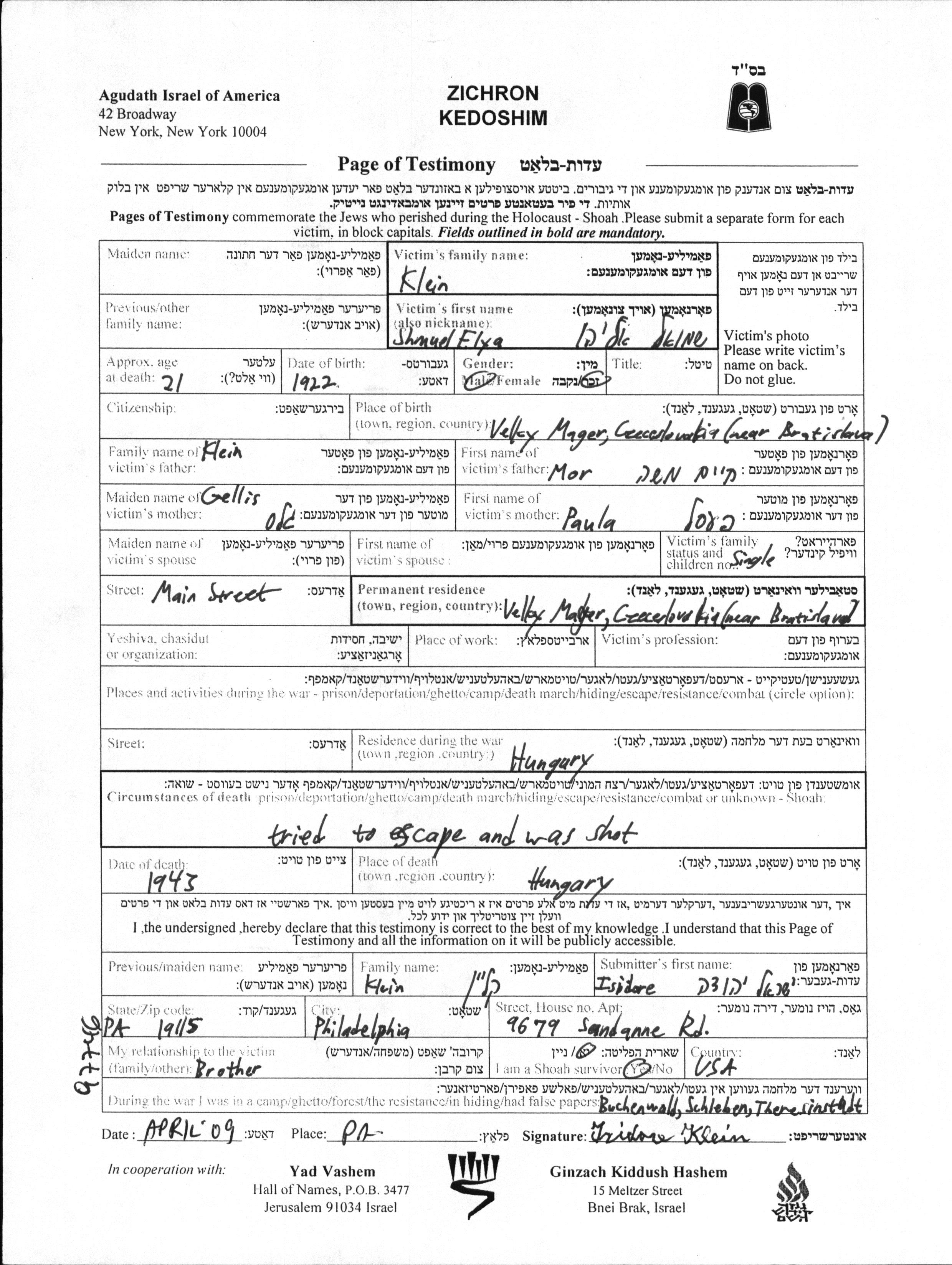 Klein | Shmuel | 1922 | Nagymagyar, Tschechoslowakei | Gedenkblatt |