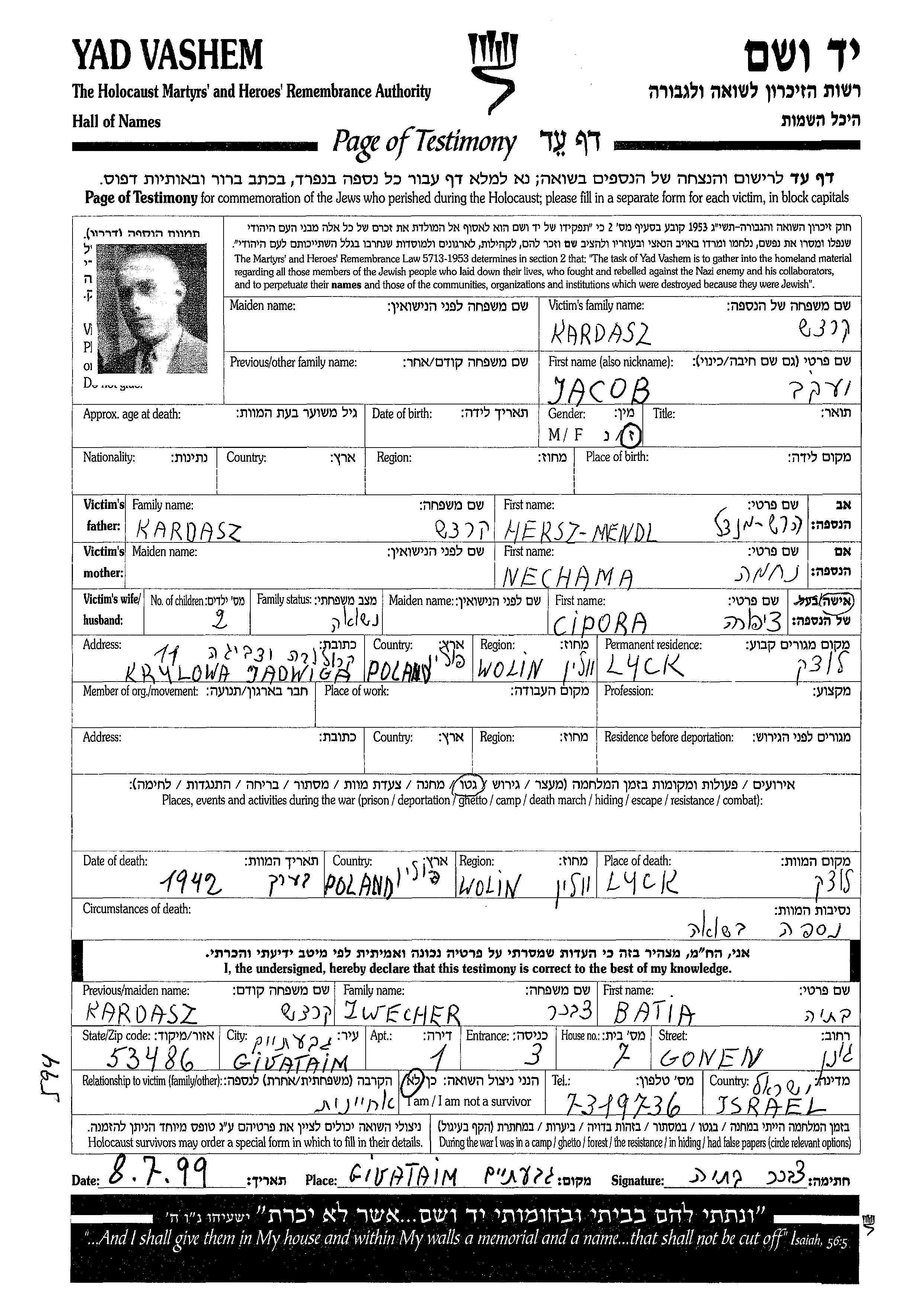 Yaakov Kardasz wurde im Jahr 1904 in Luck, Polen geboren. Vor dem Zweiten Weltkrieg lebte er in Luck, Polen.