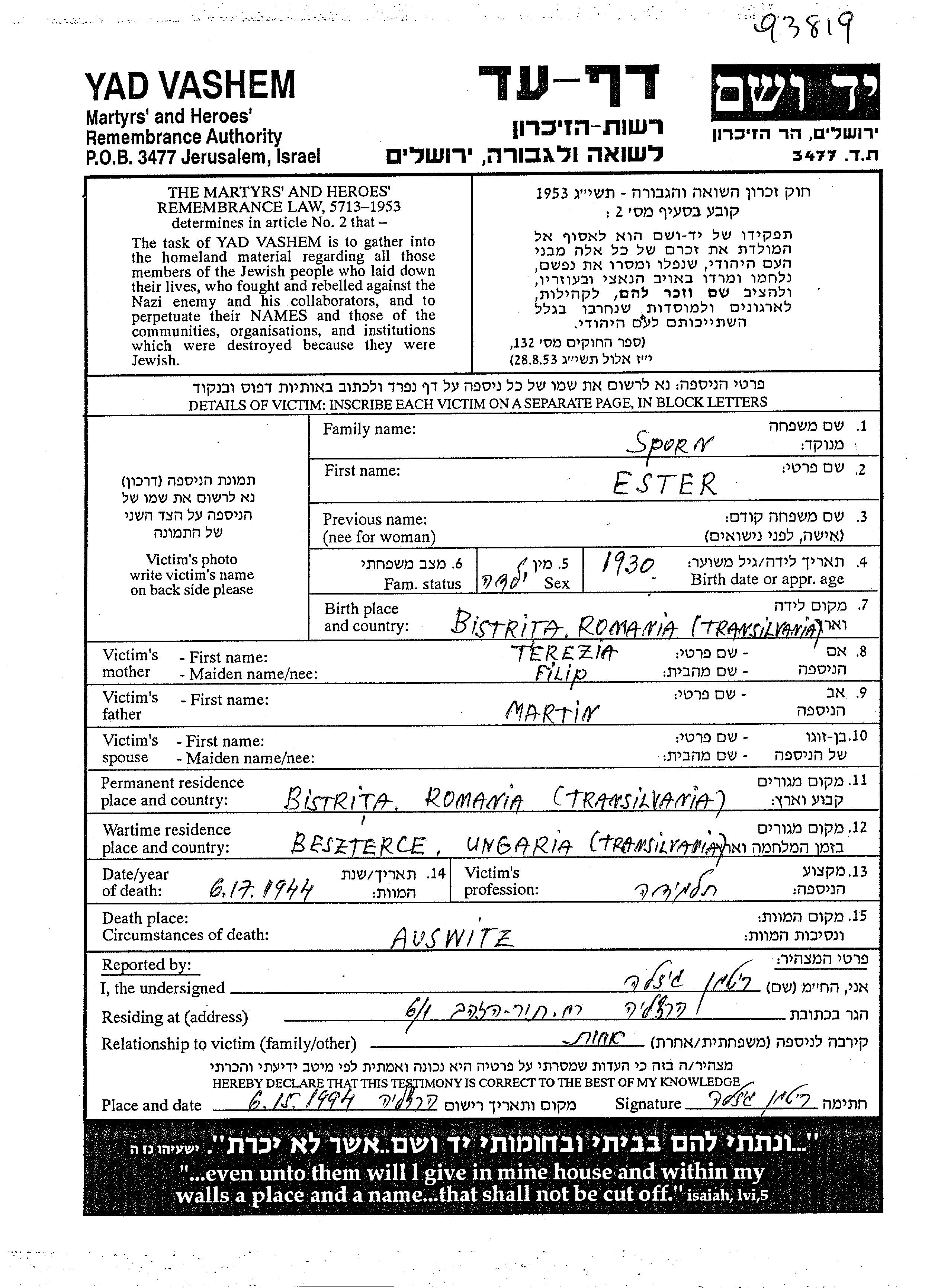 Ester Sporn Shporn wurde im Jahr 1930 geboren. Sie war Schüler/-in. Vor dem Zweiten Weltkrieg lebte sie in Bistrita, Rumänien.