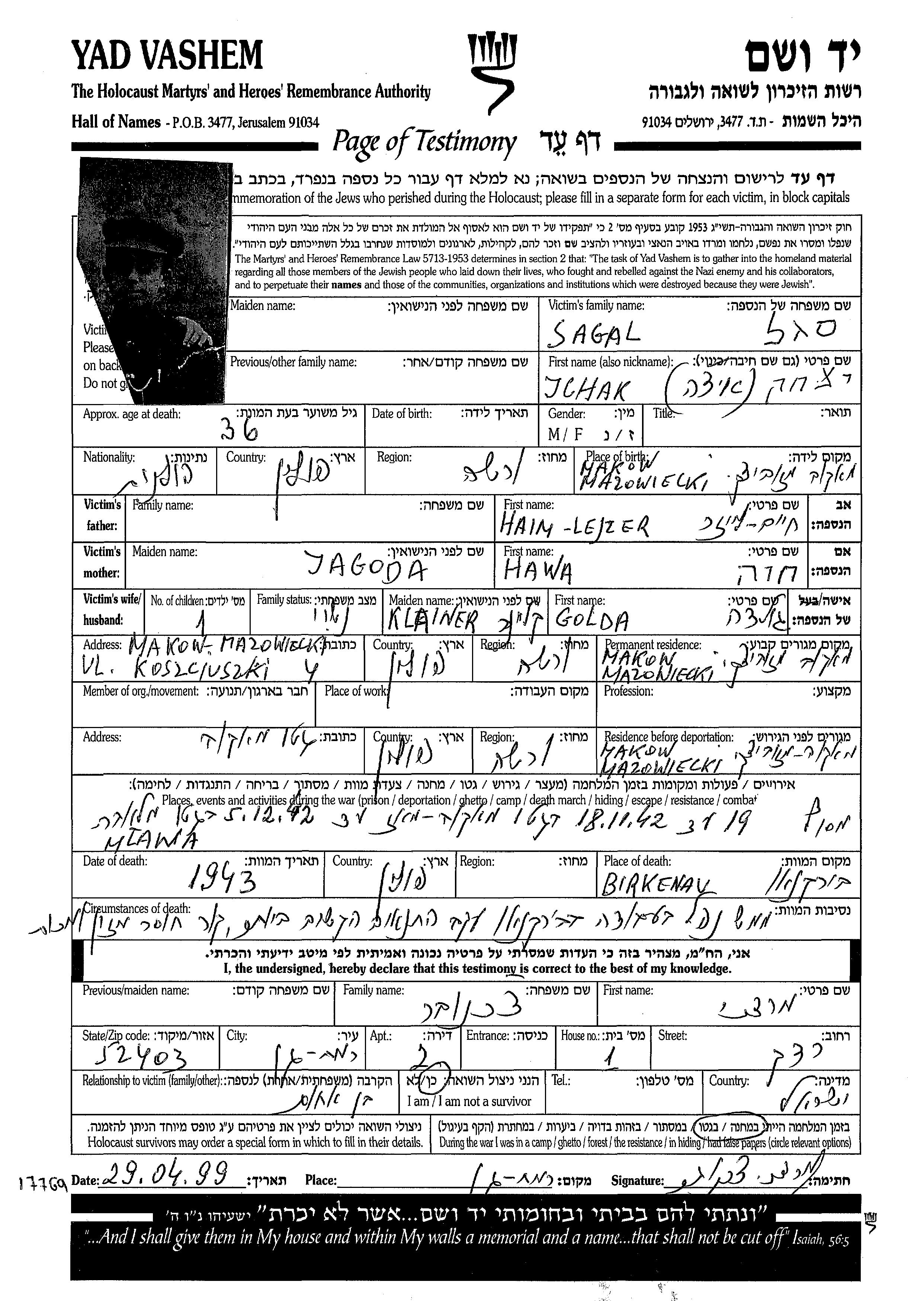 Yitzkhak Sagal wurde im Jahr 1906 geboren. Er war Kaufmann/-frau. Vor dem Zweiten Weltkrieg lebte er in Makow Mazowiecki, Polen.