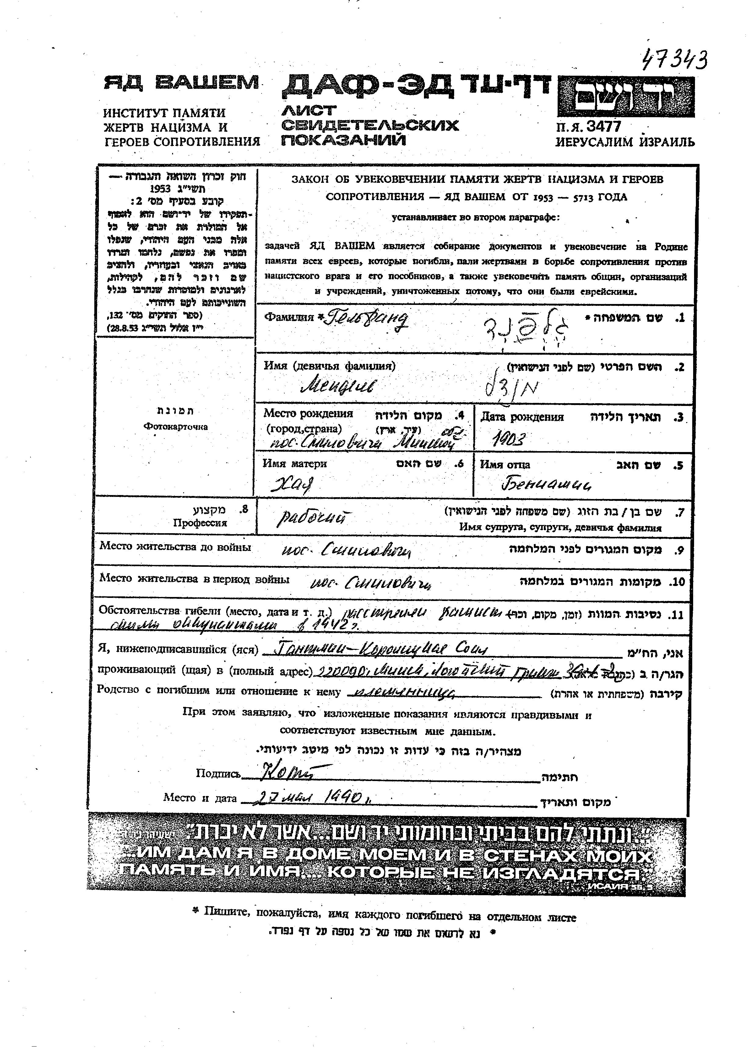 Mendel wurde in der Schoah ermordet. Todesort: Smilovichi, Weißrussland (UdSSR).