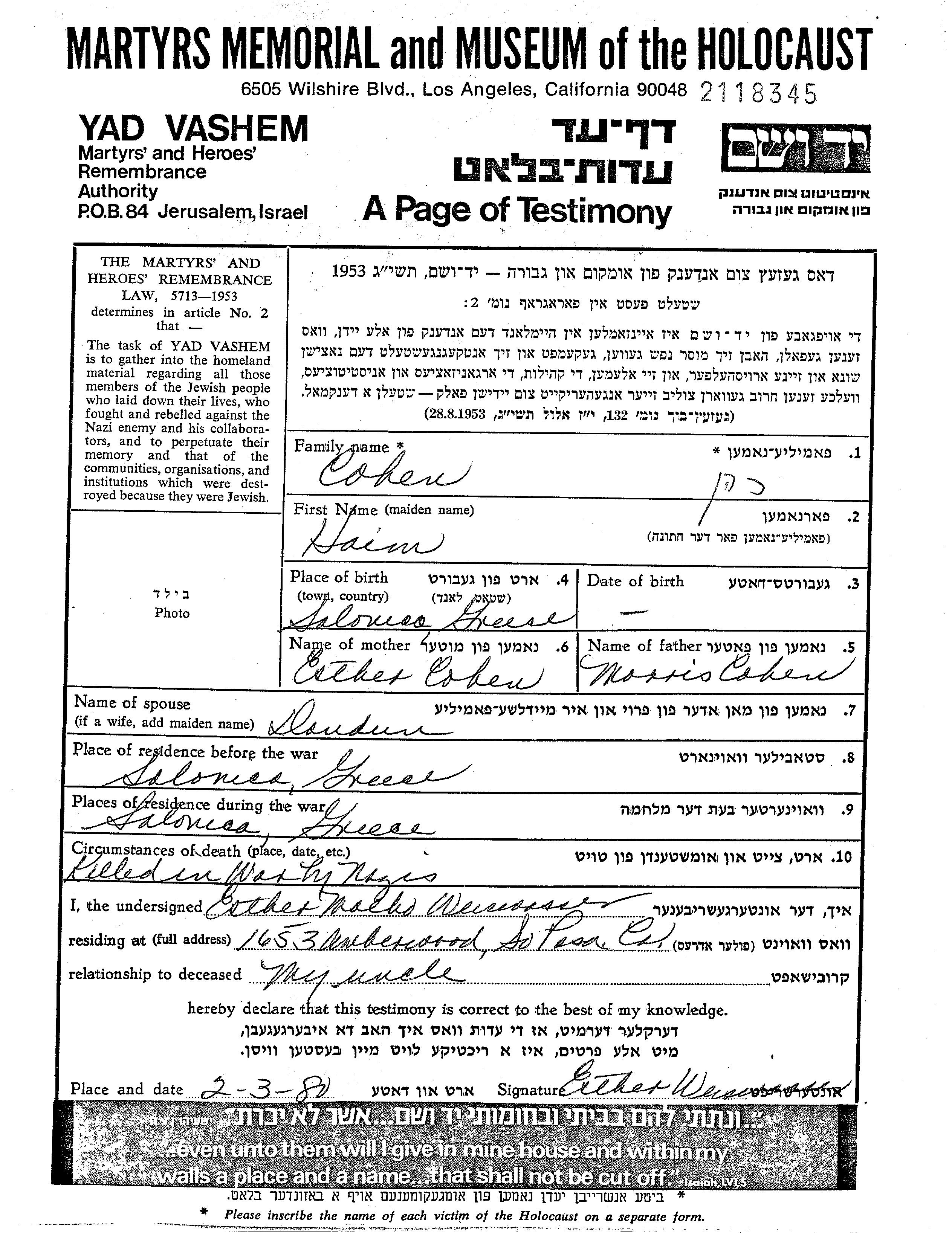 Khaim Cohen. Vor dem Zweiten Weltkrieg lebte er in Thessaloniki, Griechenland.