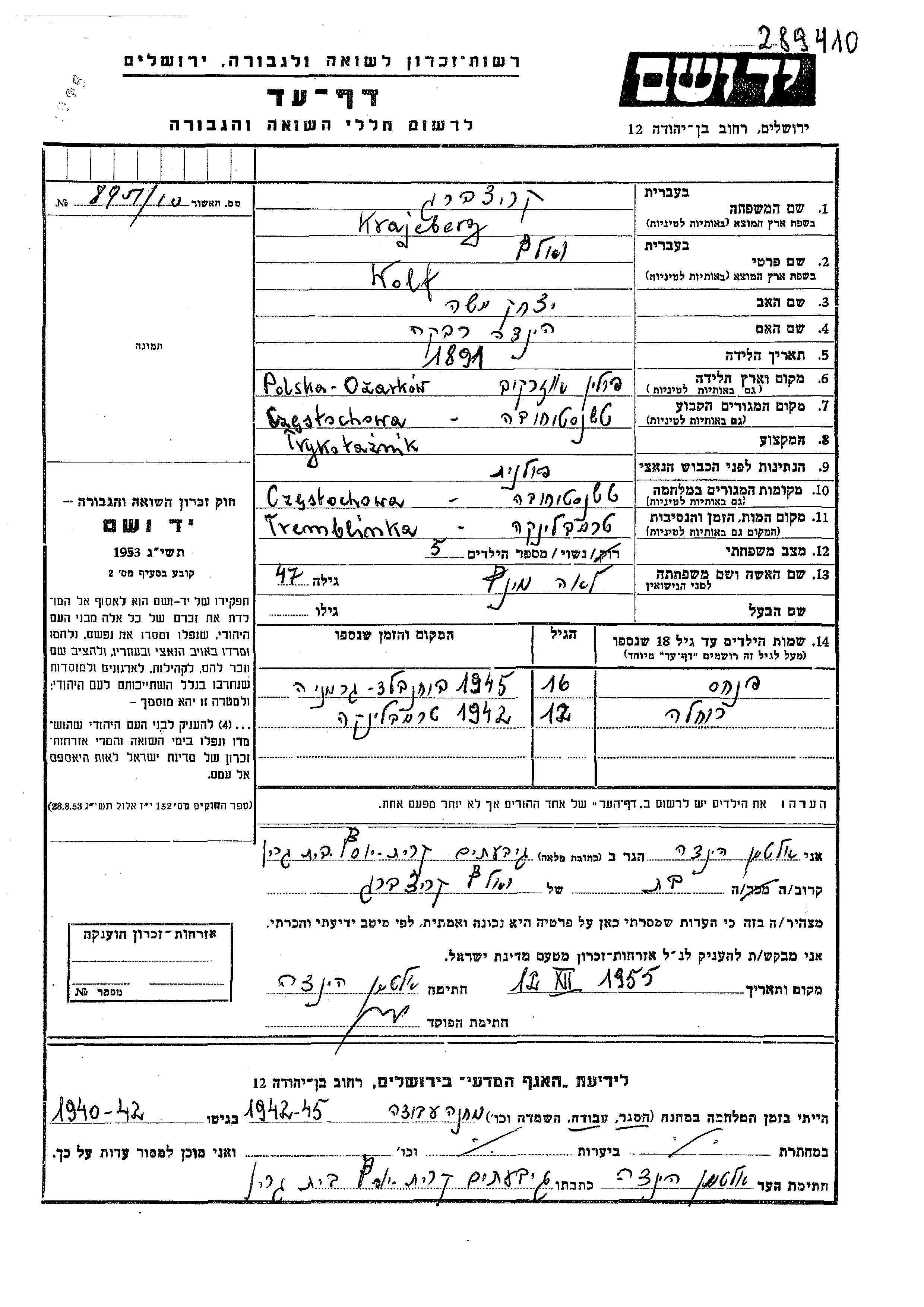 Wolf Krajcberg Kritzberg wurde im Jahr 1891 in Ozarkov, Polen geboren. Er war der Sohn von Yitzkhak Moshe und Hinda Rivka. Er war mit Lea, geb. Mintz Verheiratet. Vor dem Zweiten Weltkrieg lebte er in Czestochowa, Polen. Während des Krieges war er in Czestochowa, Polen.