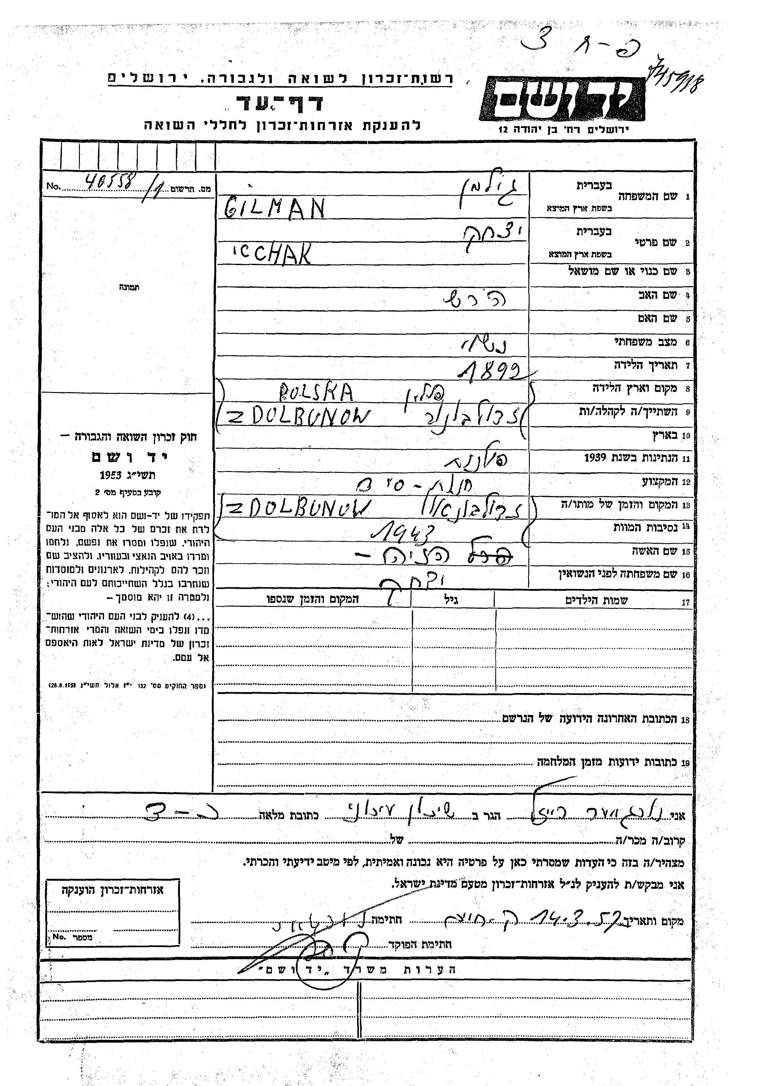 Icchak wurde in der Schoah ermordet. Todesort: Zdolbunow, Polen im Jahr 1943.