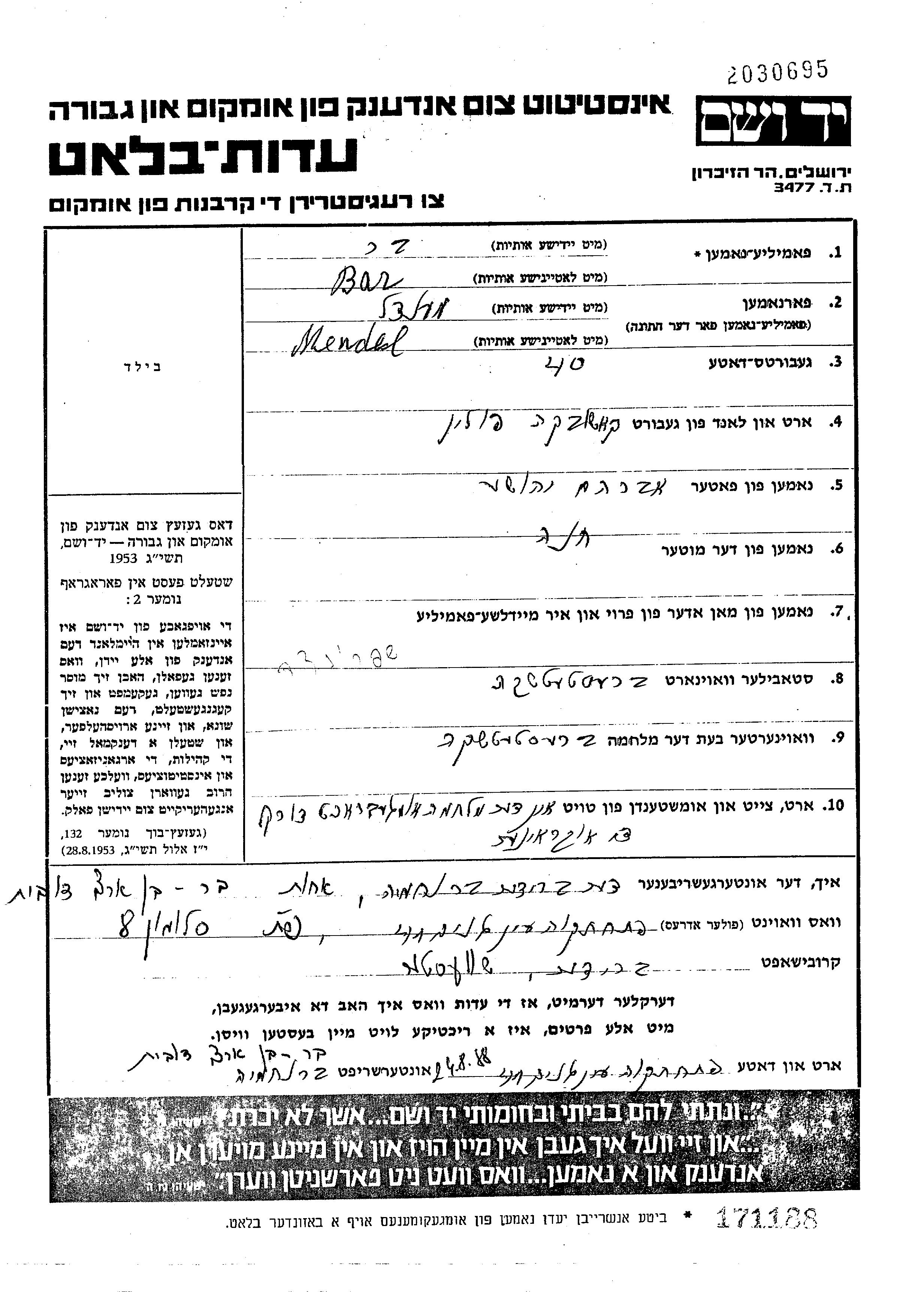 Mendel Bar Ber wurde im Jahr 1900 geboren. Er war Kaufmann/-frau. Vor dem Zweiten Weltkrieg lebte er in Beresteczko, Polen.