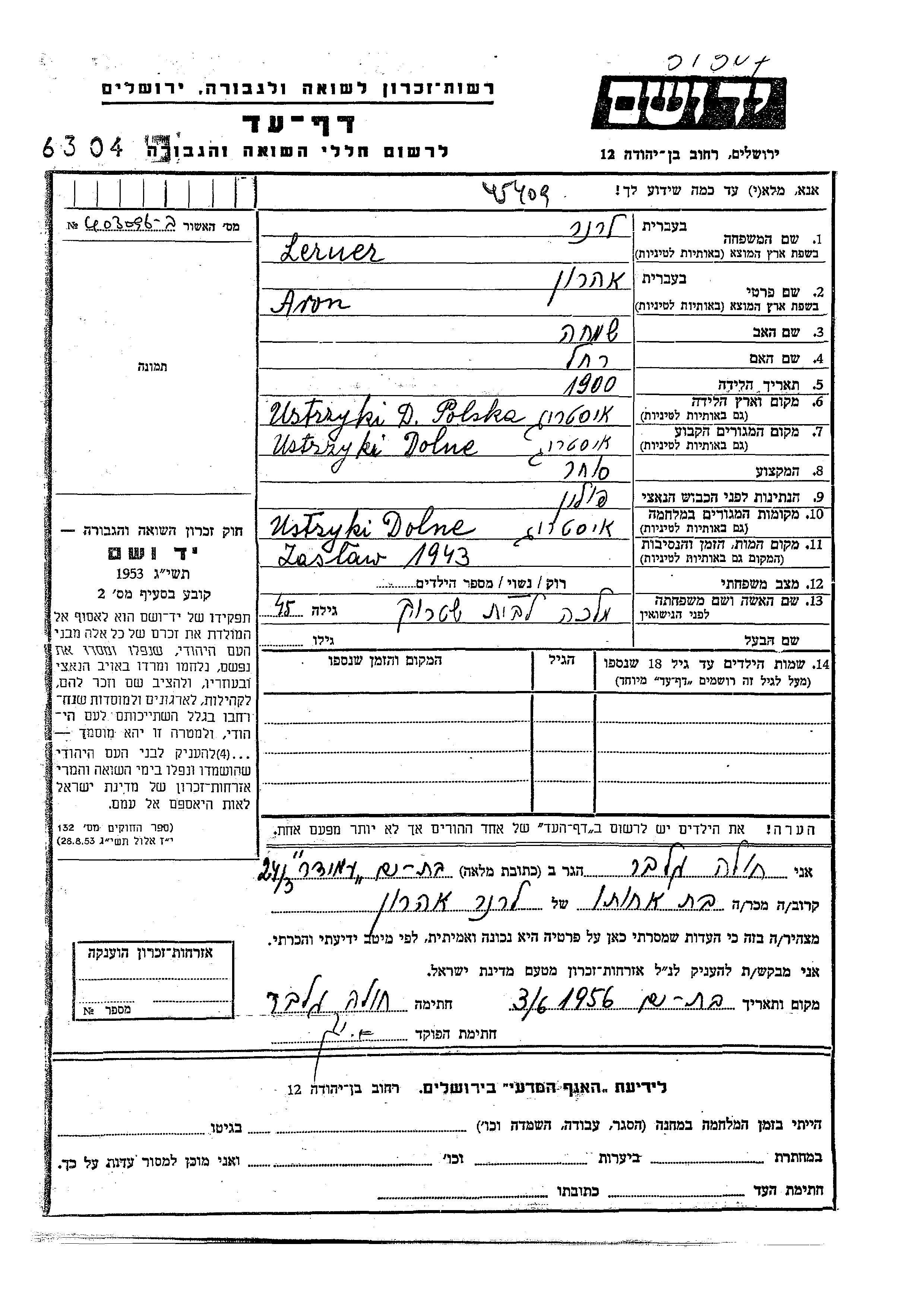 Aharon Lerner wurde im Jahr 1900 in Ustrzyki Dolne, Polen geboren. Er war Kaufmann/-frau. Vor dem Zweiten Weltkrieg lebte er in Ustrzyki Dolne, Polen.