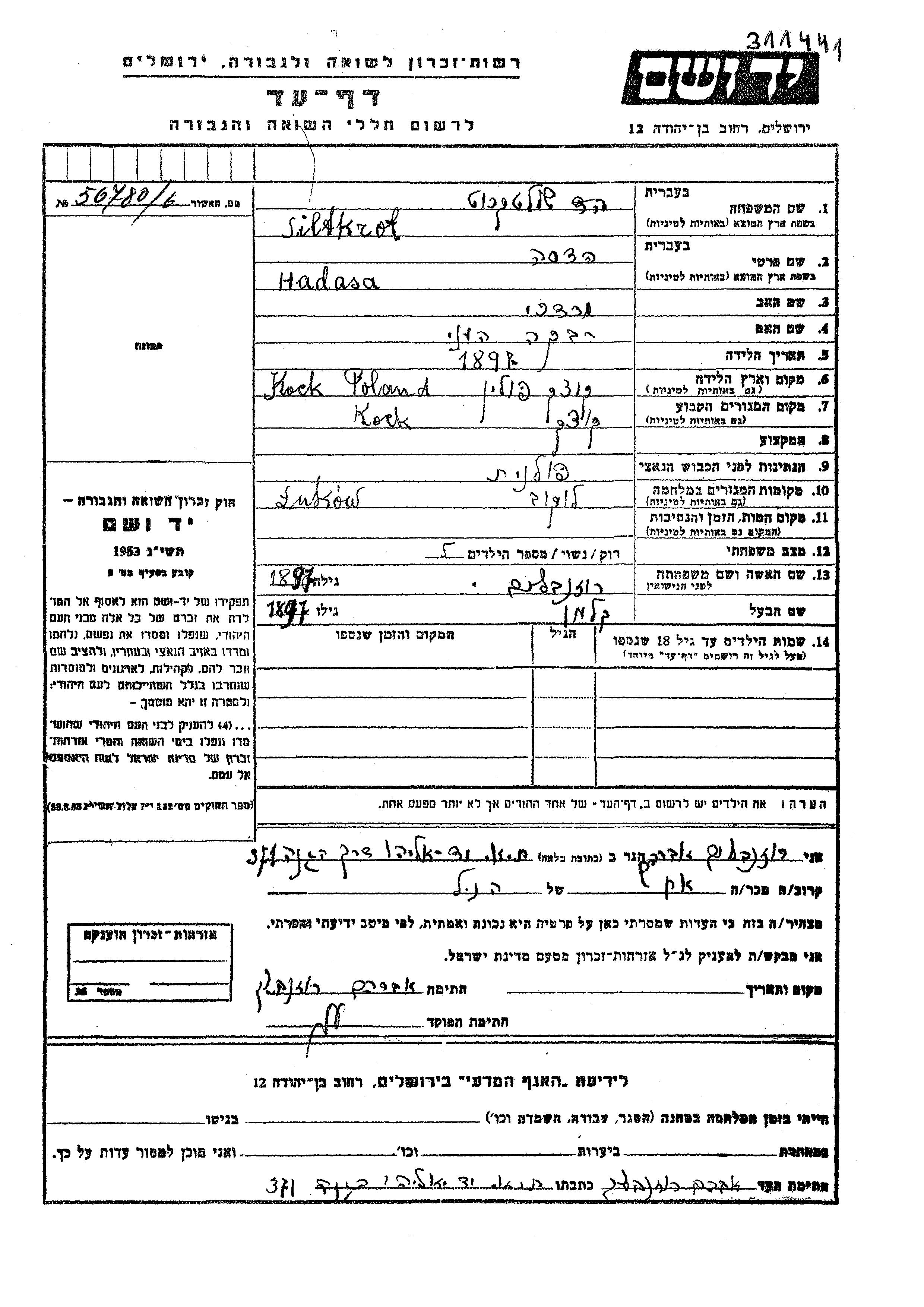 Hadasa Rozenblum Siltkrot, geb. Rozenblum wurde im Jahr 1897 in Kock, Polen geboren. Vor dem Zweiten Weltkrieg lebte sie in Kock, Polen.