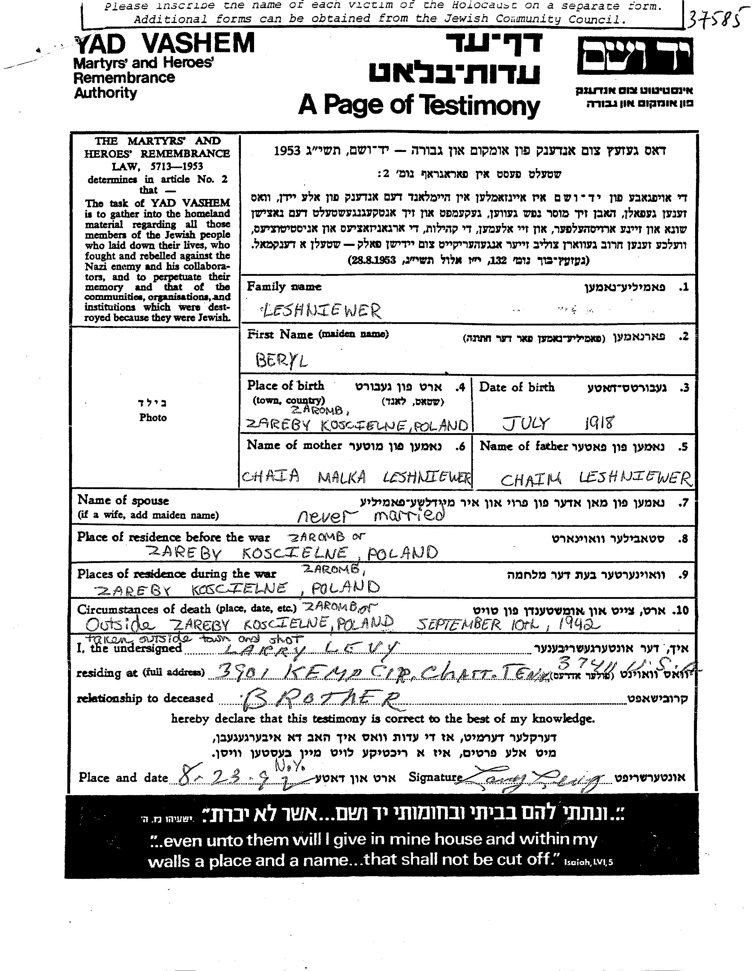 | Leshniewer | Beryl | 1918 | Zareby Koscielne, Polen | Gedenkblatt |