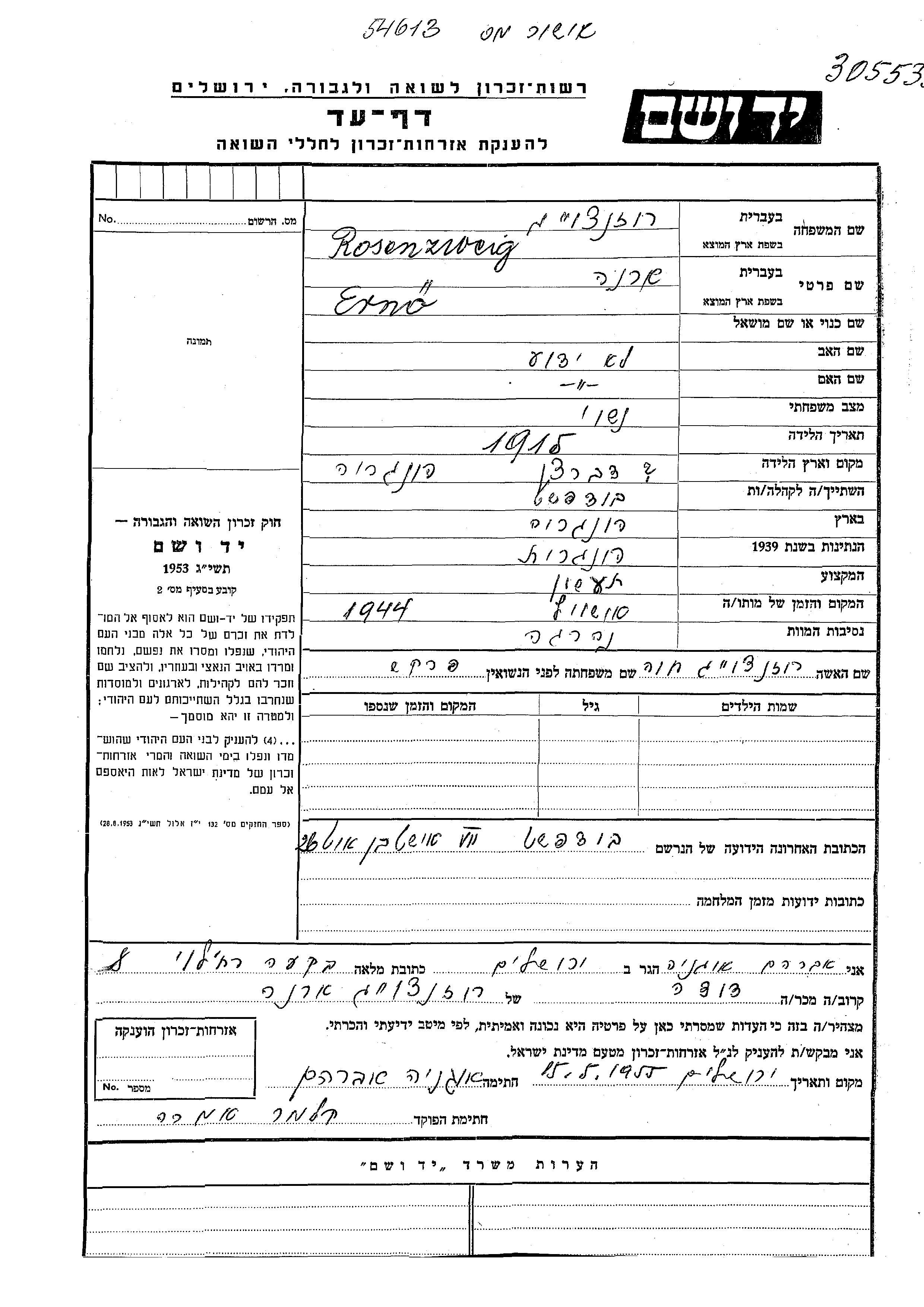 Erno Erna Rosenzweig wurde im Jahr 1915 in Debrecen, Ungarn geboren. Er war Industrielle/-r und mit Khava, geb. Farkash Verheiratet. Vor dem Zweiten Weltkrieg lebte er in Budapest, Ungarn.