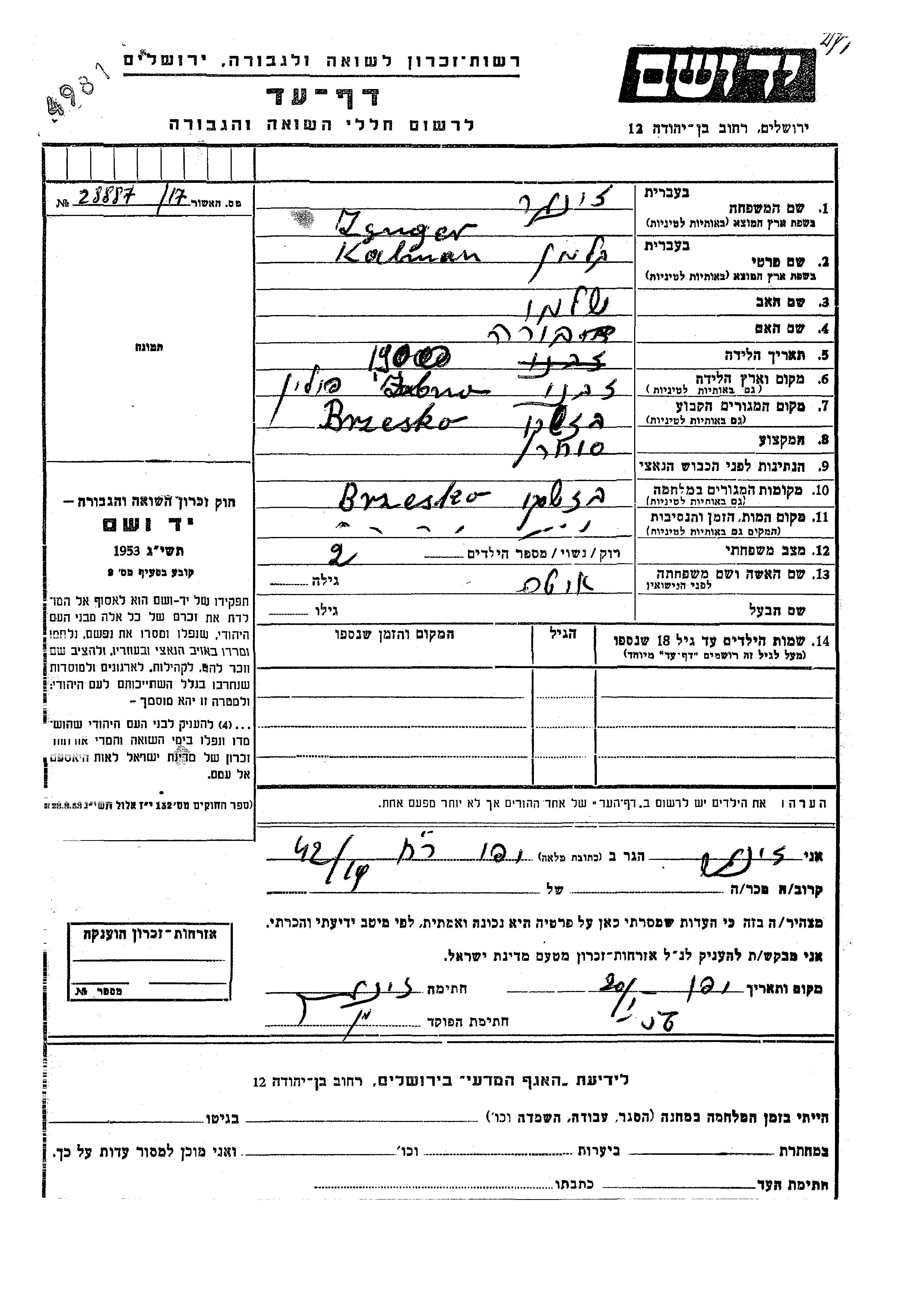 Kalman wurde in der Schoah ermordet. Todesort: Brzesko, Polen.
