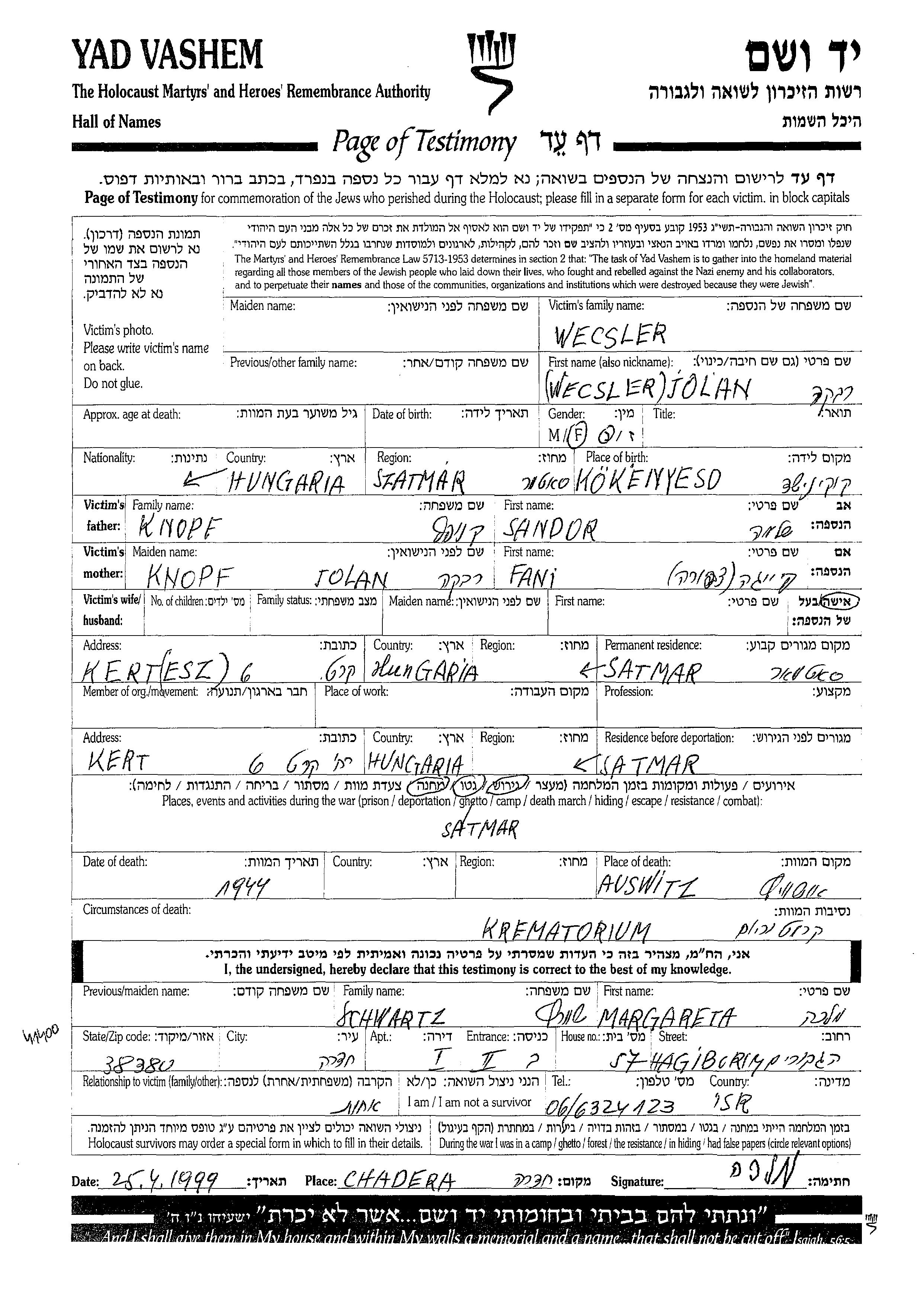 Wechsler | Jolan Rivka | 1910 | Satu Mare, Rumänien | Gedenkblatt |