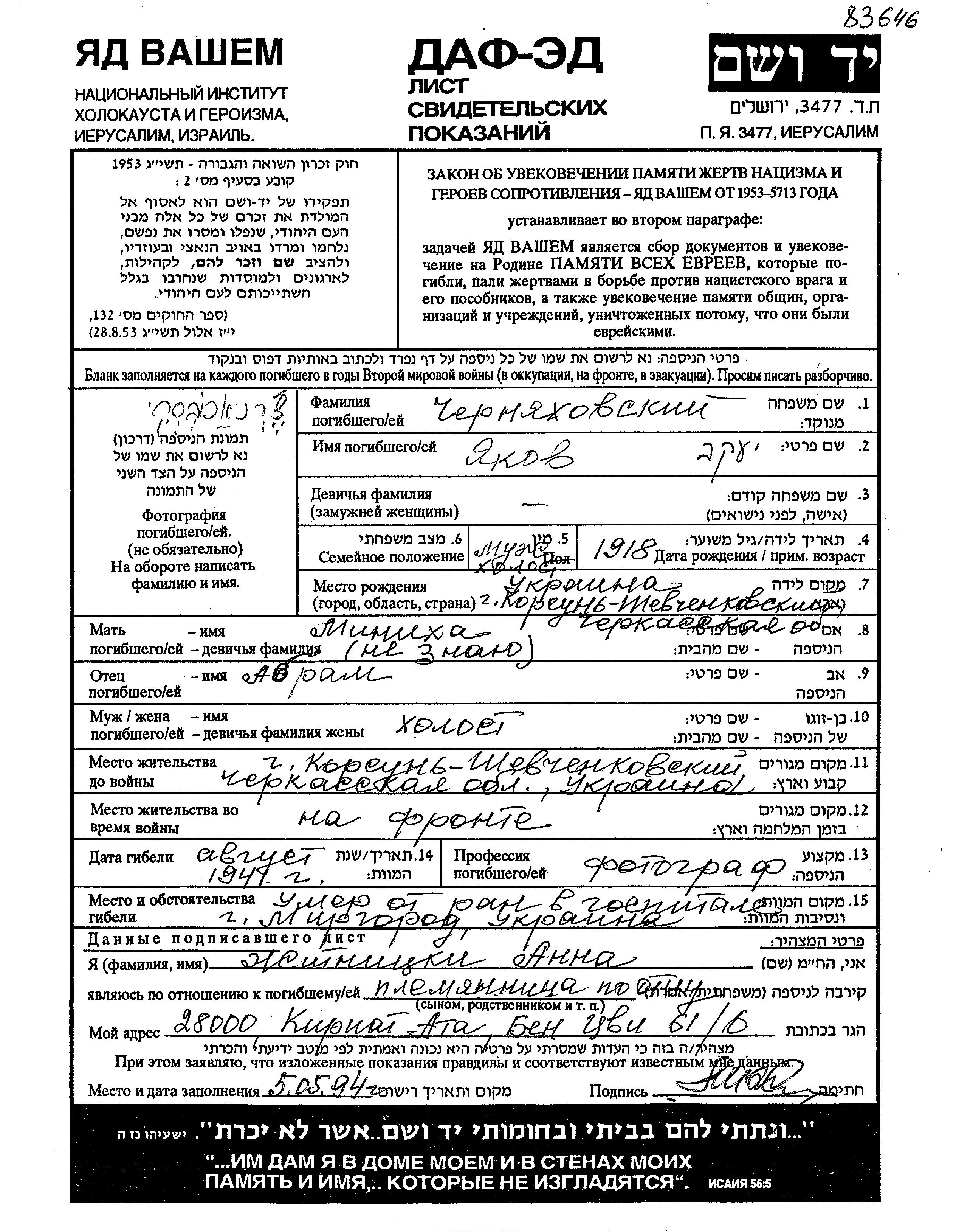 Yaakov im Militärdienst umgekommen. Todesort: Mirgorod, Ukraine (UdSSR) im Jahr 1941.