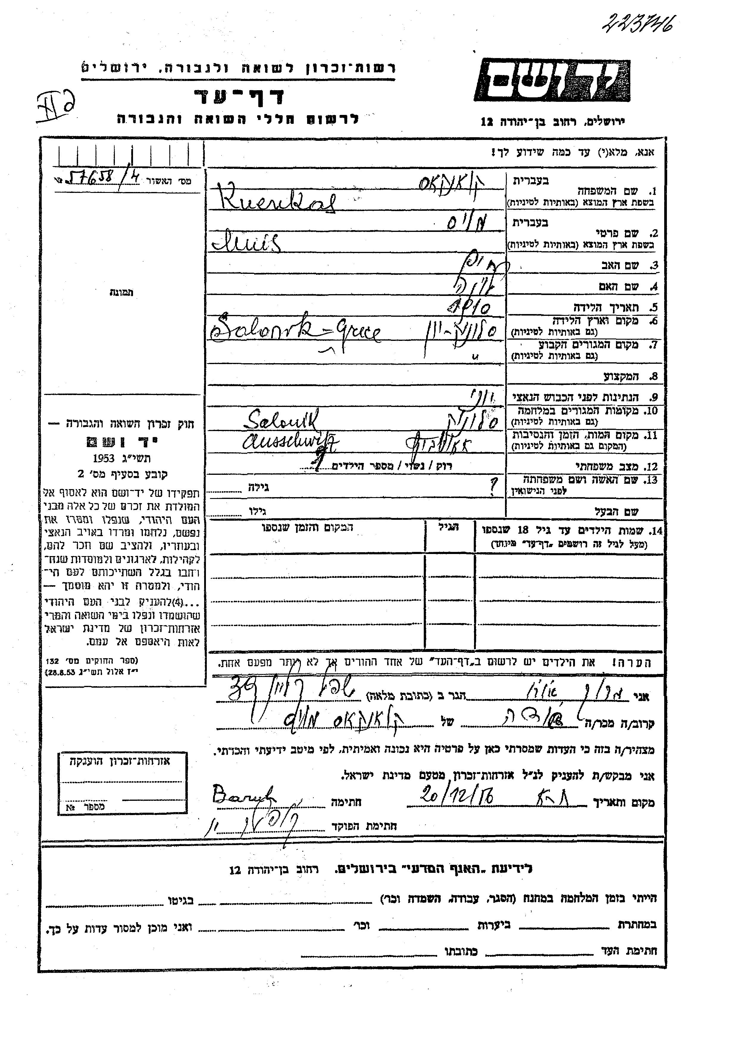 Moshe Luis wurde in der Schoah ermordet. Todesort: Auschwitz, Polen.