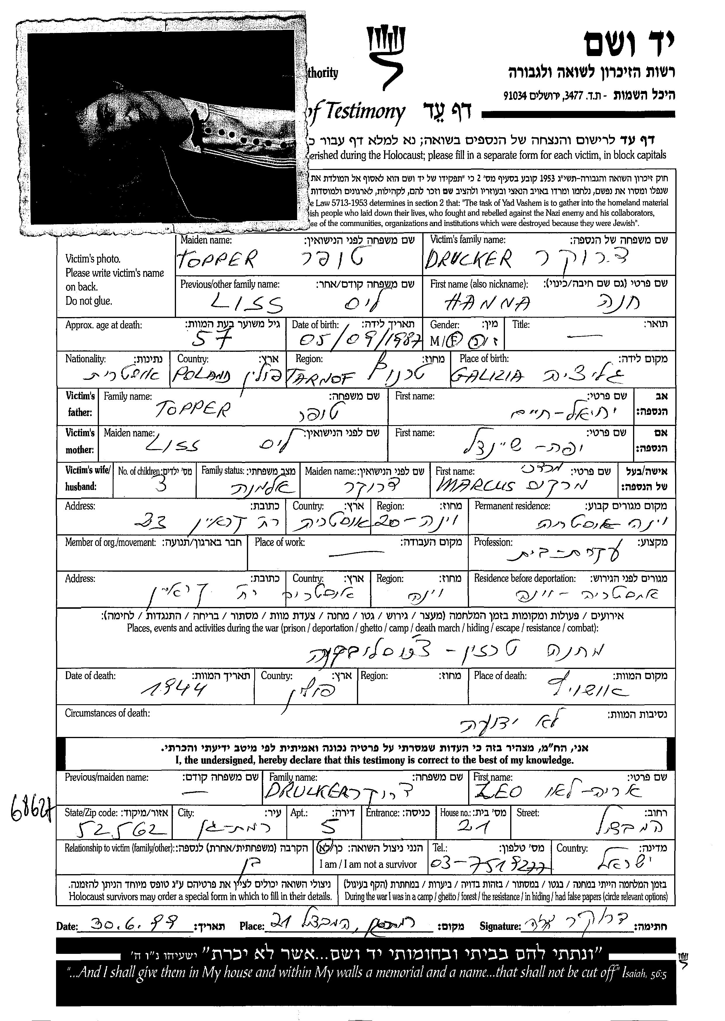 Khana Drucker Liss, geb. Topper wurde im Jahr 1887 geboren. Sie war Hausfrau. Vor dem Zweiten Weltkrieg lebte sie in Wien, Österreich.